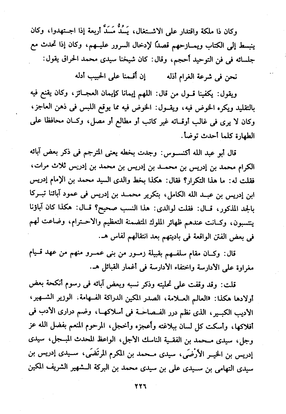 قال أبو عبد الله أكنسوس: وجدت بخطه يعني المترجم في ذكر بعض آبائه الكرام محمد بن إدريس بن محمد بن إدريس بن محمد بن إدريس ثلاث مرات، فقلت له: ما هذا التكرار؟ فقال: هكذا بخط والدى السيد محمد بن الإمام إدريس ابن إدريس بن عبد الله الكامل، بتكرير محمد بن إدريس في عمود آبائنا تبركا بالجد المذكور، قال: فقلت لوالدى: هذا النسب صحيح؟ قال: هكذا كان آباؤنا ينتسبون، وكانت عندهم ظهائر الملوك المتضمنة التعظيم والاحترام، وضاعت لهم في بعض الفتن الواقعة في باديتهم بعد انتقالهم لفاس هـ.
