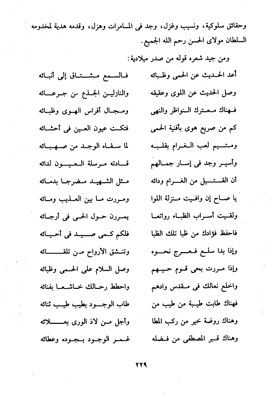 وحقائق سلوكية، ونسيب وغزل، وجد في المسامرات وهزل، وقدمه هدية لمخدومه السلطان مولاى الحسن رحم الله الجميع.