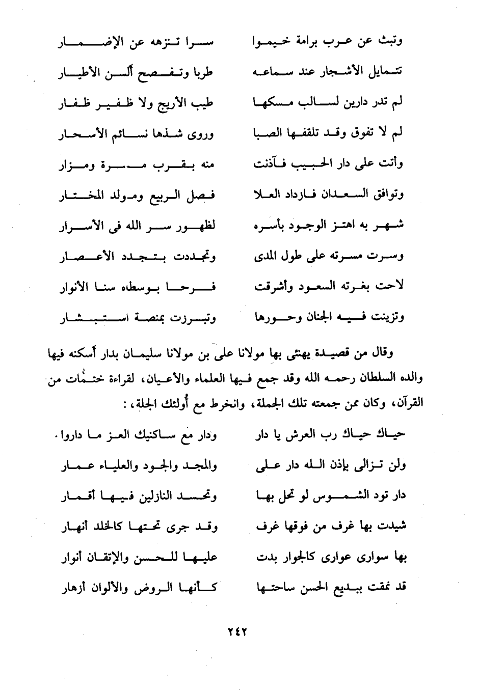 وقال من قصيدة يهنئ بها مولانا على بن مولانا سليمان بدار أسكنه فيها والده السلطان رحمه الله وقد جمع فيها العلماء والأعيان، لقراءة ختمات من القرآن، وكان ممن جمعته تلك الجملة، وانخرط مع أولئك الجلة،: