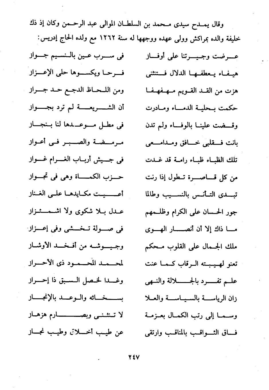 وقال يمدح سيدى محمد بن السلطان الموالى عبد الرحمن وكان إذ ذك خليفة والده بمراكش وولى عهده ووجهها له سنة 1262 مع ولده الحاج إدريس: