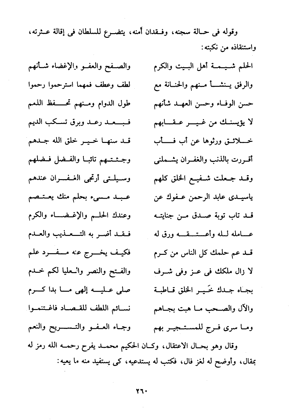 وقوله في حالة سجنه، وفقدان أمنه، يتضرع للسلطان في إقالة عثرته، واستنقاذه من نكبته: