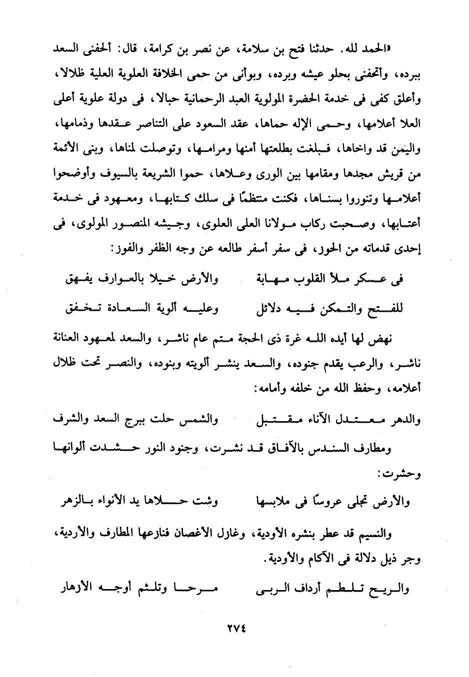 "الحمد لله. حدثنا فتح بن سلامة، عن نصر بن كرامة، قال: ألحفنى السعد ببرده، وأتحفنى بحلو عيشه وبرده، وبوأنى من حمى الخلافة العلوية العلية ظلالا، وأعلق كفى في خدمة الحضرة المولوية العبد الرحمانية حبالا، في دولة علوية أعلى العلا أعلامها، وحمى الإله حماها، عقد السعود على التناصر عقدها وذمامها، واليمن قد واخاها، فبلغت بطلعتها أمنها ومرامها، وتوصلت لمناها، وبنى الأئمة من قريش مجدها ومقامها بين الورى وعلاها، حموا الشريعة بالسيوف وأوضحوا أعلامها وتنوروا بسناها، فكنت منتظمًا في سلك كتابها، ومعهود في خدمة أعتابها، وصحبت ركاب مولانا العلى العلوى، وجيشه المنصور المولوى، في إحدى قدماته من الحوز، في سفر أسفر طالعه عن وجه الظفر والفوز:
