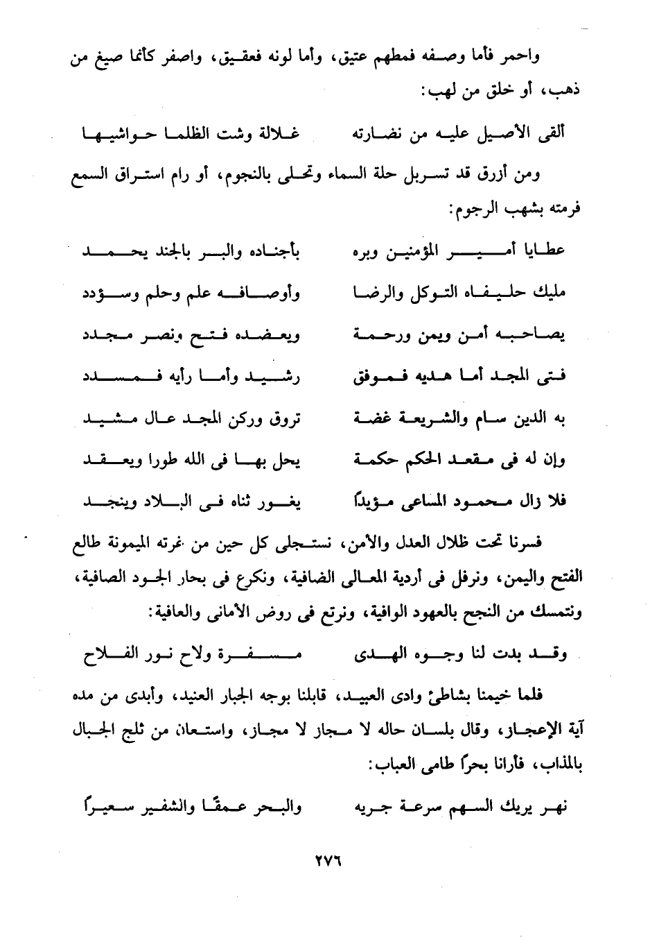 فسرنا تحت ظلال العدل والأمن، نستجلى كل حين من غرته الميمونة طالع الفتح واليمن، ونرفل في أردية المعالى الضافية، ونكرع في بحار الجود الصافية، ونتمسك من النجح بالعهود الوافية، ونرتع في روض الأمانى والعافية: