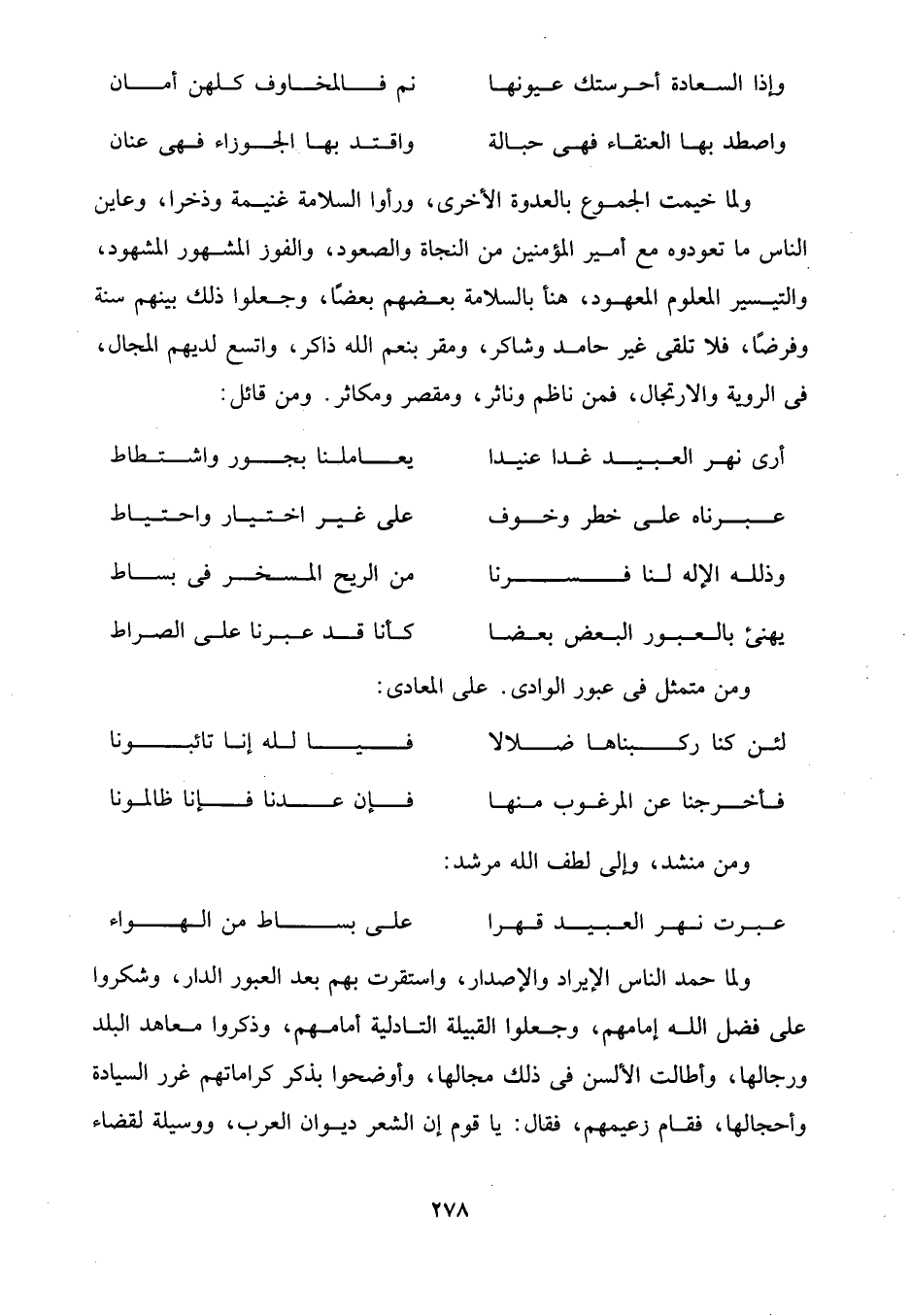 ولما خيمت الجموع بالعدوة الأخرى، ورأوا السلامة غنيمة وذخرا، وعاين الناس ما تعودوه مع أمير المؤمنين من النجاة والصعود، والفوز المشهور المشهود، والتيسير المعلوم المعهود، هنأ بالسلامة بعضهم بعضًا، وجعلوا ذلك بينهم سنة وفرضًا، فلا تلقى غير حامد وشاكر، ومقر بنعم الله ذاكر، واتسع لديهم المجال، في الروية والارتجال، فمن ناظم وناثر، ومقصر ومكاثر. ومن قائل: