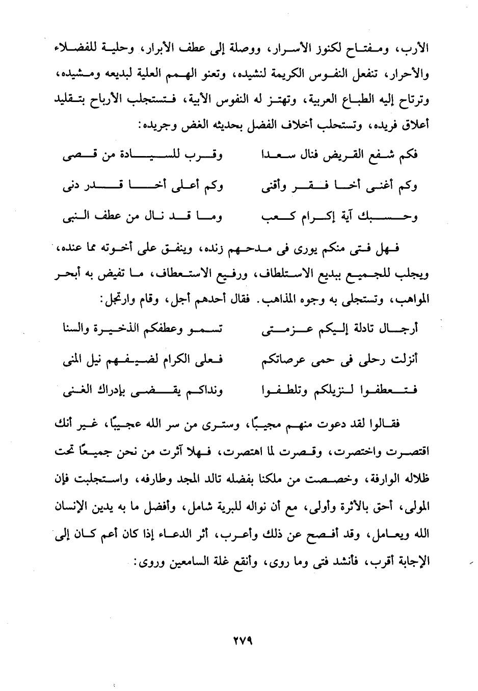 الأرب، ومفتاح لكنوز الأسرار، ووصلة إلى عطف الأبرار، وحلية للفضلاء والأحرار، تنفعل النفوس الكريمة لنشيده، وتعنو الهمم العلية لبديعه ومشيده، وترتاح إليه الطباع العربية، وتهتز له النفوس الأبية، فتستجلب الأرباح بتقليد أعلاق فريده، وتستحلب أخلاف الفضل بحديثه الغض وجريده: