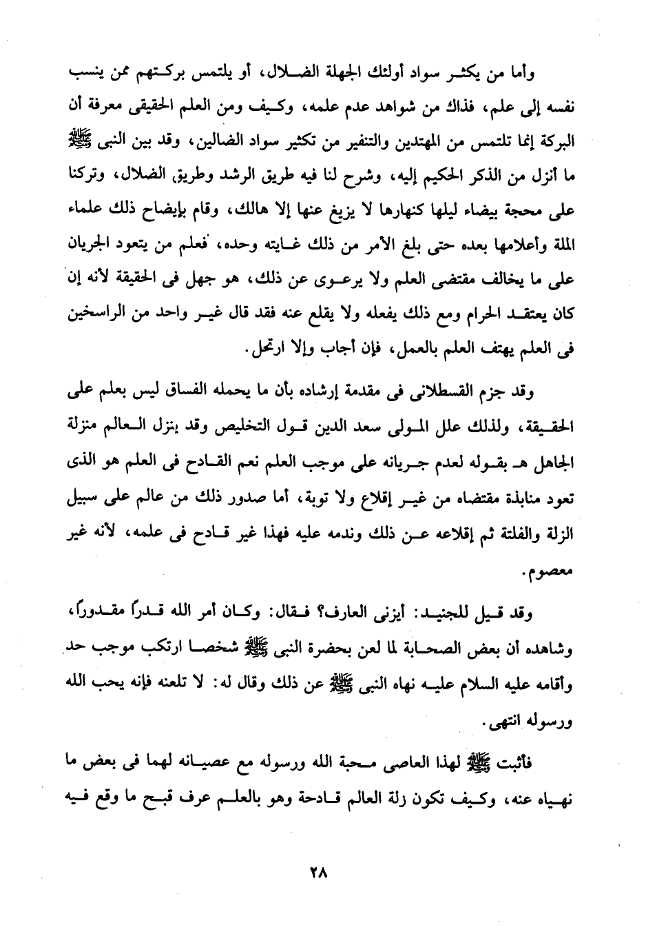 وأما من يكثر سواد أولئك الجهلة الضلال، أو يلتمس بركتهم ممن ينسب نفسه إلى علم، فذاك من شواهد عدم علمه، وكيف ومن العلم الحقيقى معرفة أن البركة إنما تلتمس من المهتدين والتنفير من تكثير سواد الضالين، وقد بين النبى - صلى الله عليه وسلم - ما أنزل من الذكر الحكيم إليه، وشرح لنا فيه طريق الرشد وطريق، الضلال، وتركنا على محجة بيضاء ليلها كنهارها لا يزيغ عنها إلا هالك، وقام بإيضاح ذلك علماء الملة وأعلامها بعده حتى بلغ الأمر من ذلك غايته وحده، فعلم من يتعود الجريان على ما يخالف مقتضى العلم ولا يرعوى عن ذلك، هو جهل في الحقيقة لأنه إن كان يعتقد الحرام ومع ذلك يفعله ولا يقلع عنه فقد قال غير واحد من الراسخين في العلم يهتف العلم بالعمل، فإن أجاب وإلا ارتحل.