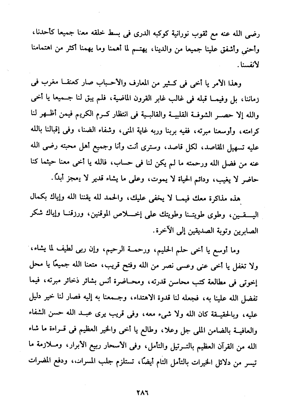 وما أوسع يا أخى حلم الحليم، ورحمة الرحيم، وإن ربى لطيف لما يشاء، ولا تغفل يا أخى عنى وعسى نصر من الله وفتح قريب، متعنا الله جميعًا يا محل إخوتى في مطالعة كتب محاسن قدرته، ومحاضرة أنس بشائر ذخائر مبرته، فيما تفضل الله علينا به، فجعله لنا قدوة الاهتداء، وجمعنا به إليه فصار لنا خير في ليل عليه، وبالحقيقة كان الله ولا شئ معه، وفى قريب يرى عبد الله حسن الشفاء والعافية بالضامن الملى جل وعلا، وطالع يا أخى والخير العظيم في قراءة ما شاء الله من القرآن العظيم بالترتيل والتأمل، وفى الأسحار ربيع الأبرار، وملازمة ما تيسر من دلائل الخيرات بالتأمل التام أيضًا، تستلزم جلب المسرات، ودفع المضرات