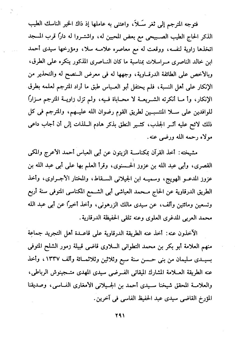 فتوجه المترجم إلى ثغر سَلَا، واعتنى به عاملها إذ ذاك الخير الناسك الطيب الذكر الحاج الطيب الصبيحى مع بعض المحبين له، واشتروا له دارًا قرب المسجد اتخذها زاوية لنفسه، ووقعت له مع معاصره علامه سلا، ومؤرخها سيدى أحمد ابن خالد الناصرى مراسلات بمناسبة ما كان الناصرى المذكور ينكره على الطرق، وبالأخص على الطائفة الدرقاوية، وجهها له في معرض النصح له والتحذير من الإنكار على أهل النسبة، فلم يحتفل أبو العباس طبق ما أراد المترجم لعلمه بطرق الإنكار، وأما أنكرته الشريعة لا محاباة فيه، ولم تزل زاوية المترجم مزارًا للوافدين على سلا المنتسبين لطريق القوم رضوان الله عليهم، والمترجم في كل ذلك لائح عليه أثر الجذب، كثير النطق بذكر هادم اللذات إلى أن أجاب داعى مولاه رحمه الله ورضى عنه.