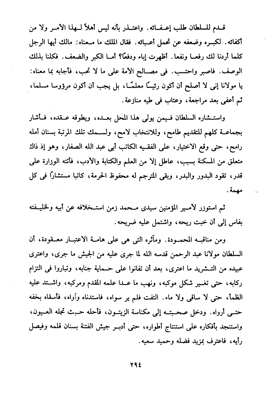 ومن مناقبه المحمودة. ومآثره التي هي على هامة الاعتبار معقودة، أن السلطان مولانا عبد الرحمن قدسه الله لما جرى عليه من الجيش ما جرى، واعترى عبيده من التشريد ما اعترى، بعد أن تفانوا على حماية جنابه، وتباروا في التزام ركابه، حتَّى تغير شكل موكبه، ونهب ما عدا علمه المقدم ومركبه، واشتد عليه الظمأ، حتَّى لا ساقى ولا ماء. التفت فلم ير سواه، فاستدناه وآواه، فأسقاه بخفه حتَّى أرواه. ودخل صحبته إلى مكناسة الزيتون، فأحله حيث تجله العيون، واستنجد بأفكاره على استنتاج أطواره، حتَّى أدبر جيش الفتنة بسنان قلمه وفيصل رأيه، فاعترف بمزيد فضله وحميد سعيه.