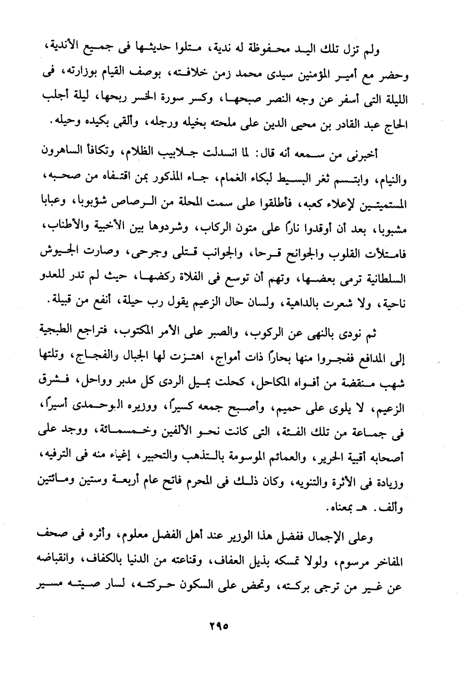ولم تزل تلك اليد محفوظة له ندية، متلوا حديثها في جميع الأندية، وحضر مع أمير المؤمنين سيدى محمد زمن خلافته، بوصف القيام بوزارته، في الليلة التي أسفر عن وجه النصر صبحها، وكسر سورة الخسر ربحها، ليلة أجلب الحاج عبد القادر بن محيى الدين على ملحته بخيله ورجله، وألقي بكيده وحيله.