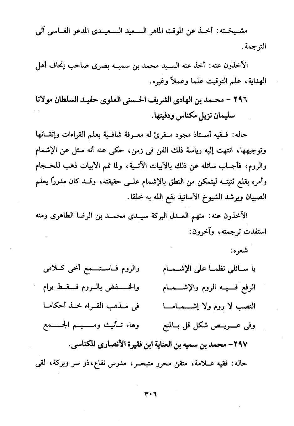 296 - محمد بن الهادى الشريف الحسنى العلوى حفيد السلطان مولانا سليمان نزيل مكناس ودفينها.