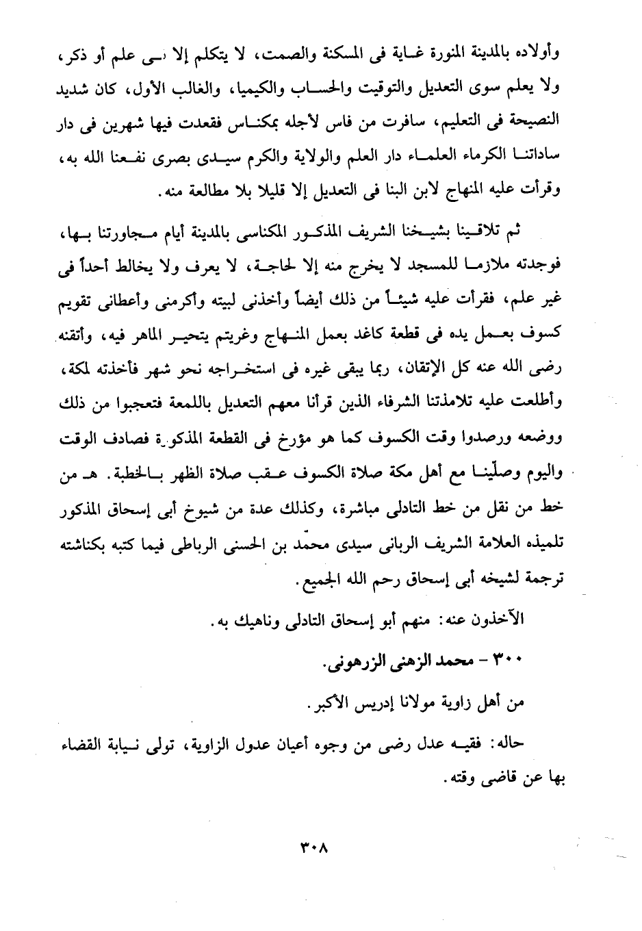 ثم تلاقينا بشيخنا الشريف المذكور المكناسى بالمدينة أيام مجاورتنا بها، فوجدته ملازما للمسجد لا يخرج منه إلا لحاجة، لا يعرف ولا يخالط أحدًا في غير علم، فقرأت عليه شيئًا من ذلك أيضًا وأخذنى لبيته وأكرمنى وأعطانى تقويم كسوف بعمل يده في قطعة كاغد بعمل المنهاج وغريتم يتحير الماهر فيه، وأتقنه رضي الله عنه كل الإتقان، ربما يبقى غيره في استخراجه نحو شهر فأخذته لمكة، وأطلعت عليه تلامذتنا الشرفاء الذين قرأنا معهم التعديل باللمعة فتعجبوا من ذلك ووضعه ورصدوا وقت الكسوف كما هو مؤرخ في القطعة المذكورة فصادف الوقت واليوم وصلَّينا مع أهل مكة صلاة الكسوف عقب صلاة الظهر بالخطبة. هـ من خط من نقل من خط التادلى مباشرة، وكذلك عدة من شيوخ أبي إسحاق المذكور تلميذه العلامة الشريف الربانى سيدى محمد بن الحسنى الرباطى فيما كتبه بكناشته ترجمة لشيخه أبي إسحاق رحم الله الجميع.