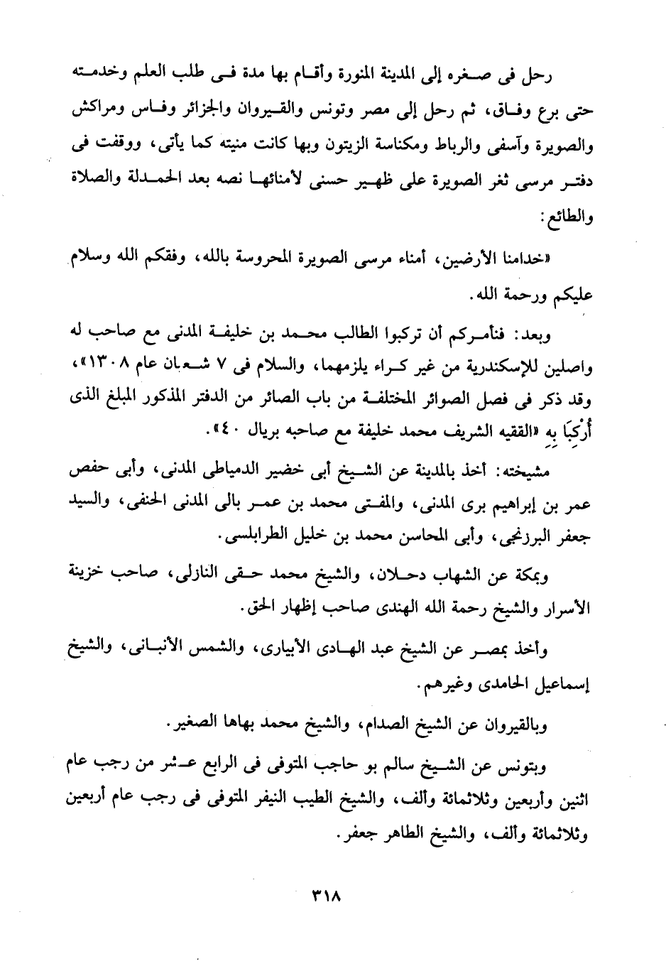 وبالقيروان عن الشيخ الصدام، والشيخ محمد بهاها الصغير.