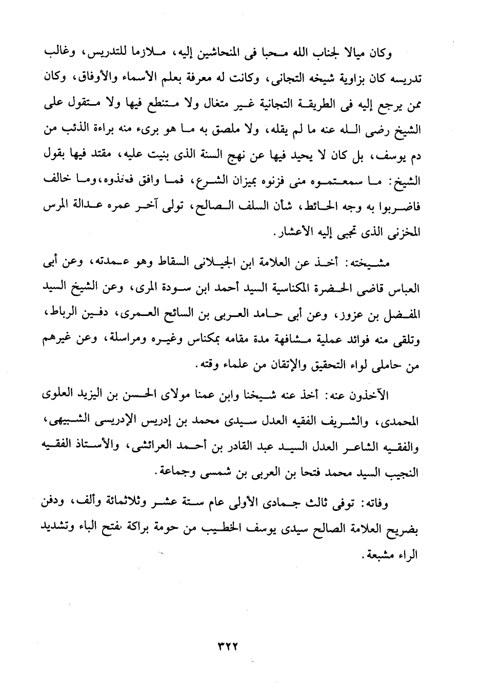 وكان ميالا لجناب الله محبا في المنحاشين إليه، ملازما للتدريس، وغالب تدريسه كان بزاوية شيخه التجانى، وكانت له معرفة بعلم الأسماء والأوفاق، وكان ممن يرجع إليه في الطريقة التجانية غير متغال ولا متنطع فيها ولا متقول على الشيخ رضي الله عنه ما لم يقله، ولا ملصق به ما هو برئ منه براءة الذئب من دم يوسف، بل كان لا يحيد فيها عن نهج السنة الَّذي بنيت عليه، مقتد فيها بقول الشيح: ما سمعتموه منى فزنوه بميزان الشرع، فما وافق فخذوه، وما خالف فاضربوا به وجه الحائط، شأن السلف الصالح، تولى آخر عمره عدالة المرس المخزنى الَّذي تجبى إليه الأعشار.
