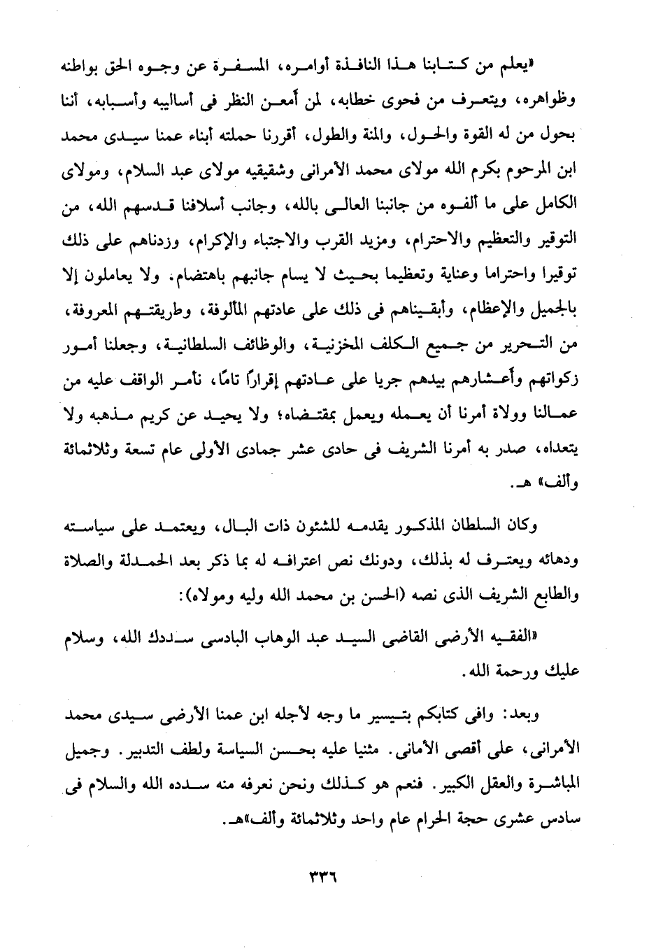وبعد: وافى كتابكم بتيسير ما وجه لأجله ابن عمنا الأرضى سيدي محمَّد الأمرانى، على أقصى الأمانى. مثنيا عليه بحسن السياسة ولطف التدبير. وجميل المباشرة والعقل الكبير. فنعم هو كذلك ونحن نعرفه منه سدده الله والسلام في سادس عشرى حجة الحرام عام واحد وثلاثمائة وألف" هـ.