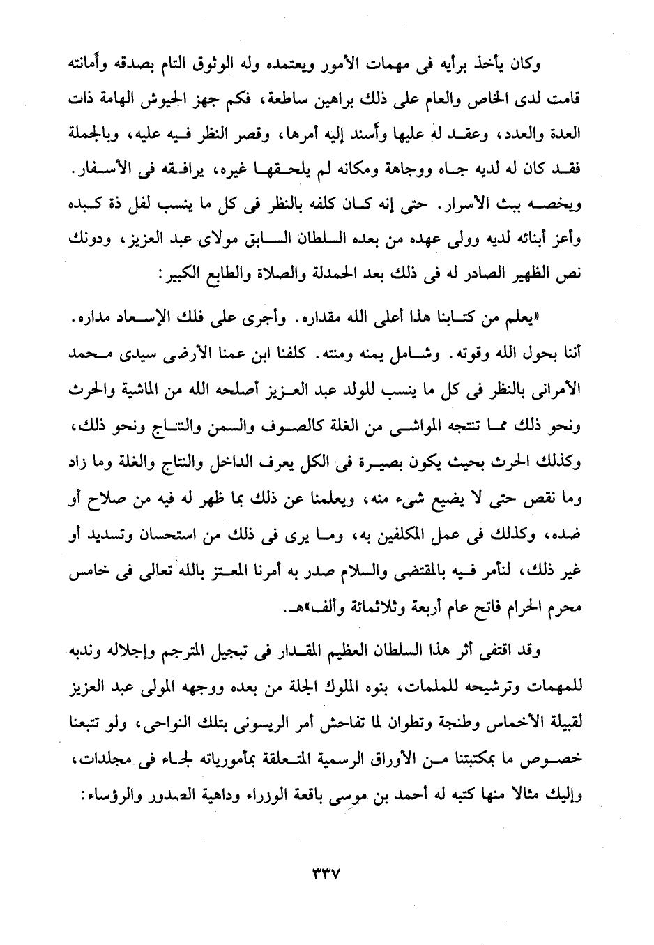 "يعلم من كتابنا هذا أعلى الله مقداره. وأجرى على فلك الإسعاد مداره. أننا بحول الله وقوته. وشامل يمنه ومنته. كلفنا ابن عمنا الأرضى سيدي محمَّد الأمرانى بالنظر في كل ما ينسب للولد عبد العزيز أصلحه الله من الماشية والحرث ونحو ذلك مما تنتجه المواشى من الغلة كالصوف والسمن والنتاج ونحو ذلك، وكذلك الحرث بحيث يكون بصيرة في الكل يعرف الداخل والنتاج والغلة وما زاد وما نقص حتى لا يضيع شيء منه، ويعلمنا عن ذلك بما ظهر له فيه من صلاح أو ضده، وكذلك في عمل المكلفين به، وما يرى في ذلك من استحسان وتسديد أو غير ذلك، لنأمر فيه بالمقتضى والسلام صدر به أمرنا المعتز بالله تعالى في خامس محرم الحرام فاتح عام أربعة وثلاثمائة وألف" هـ.