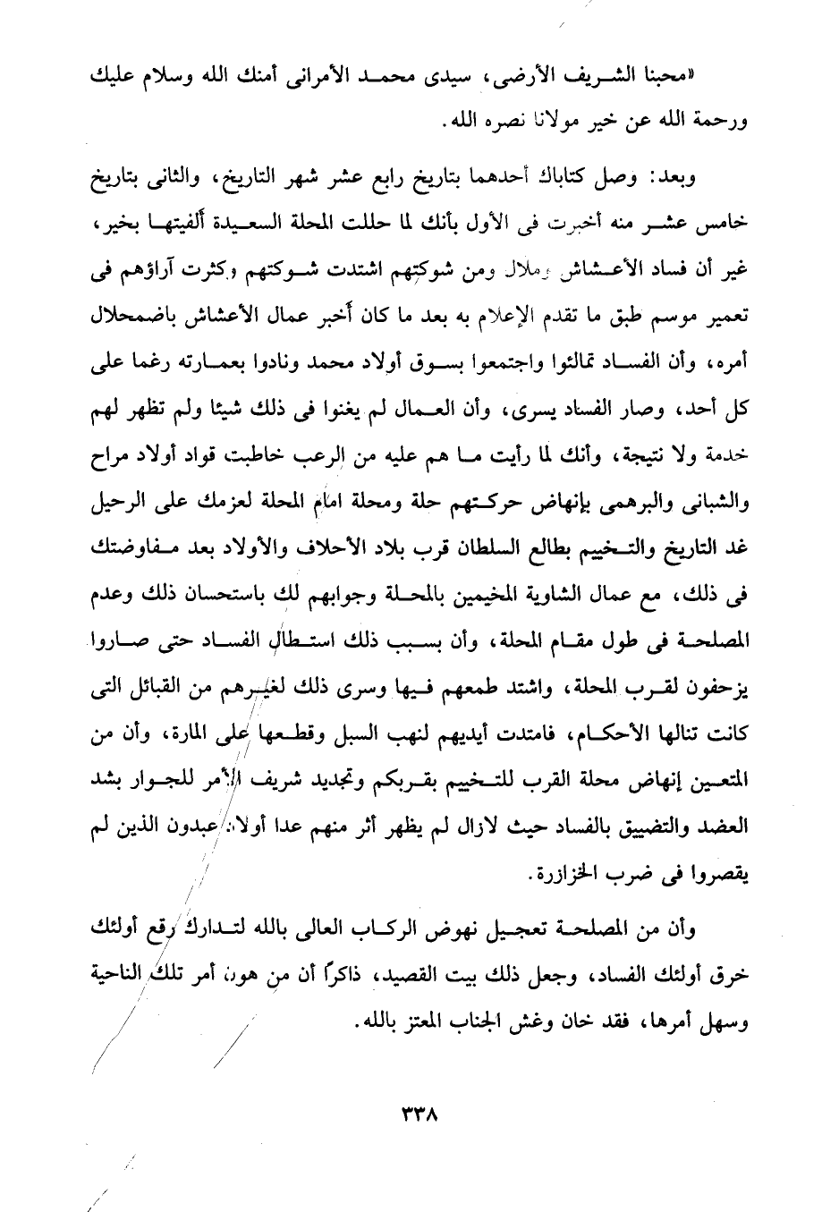 وبعد: وصل كتاباك أحدهما بتاريخ رابع عشر شهر التاريخ, والثانى بتاريخ خامس عشر منه أخبرت في الأول بأنك لما حللت المحلة السعيدة أَلفيتها بخير، غير أن فساد الأعشاش وملال ومن شوكتِهم اشتدت شوكتهم وكثرت آراؤهم في تعمير موسم طبق ما تقدم الإعلام به بعد ما كان أخبر عمال الأعشاش باضمحلال أمره، وأن الفساد تمالئوا واجتمعوا بسوق أولاد محمَّد ونادوا بعمارته رغما على كل أحد، وصار الفساد يسرى، وأن العمال لم يغنوا في ذلك شيئًا ولم تظهر لهم خدمة ولا نتيجة، وأنك لما رأيت ما هم عليه من الرعب خاطبت، قواد أولاد مراح والشبانى والبرهمى بإنهاض حركتهم حلة ومحلة امام المحلة لعزمك على الرحيل غد التاريخ والتخييم بطالع السلطان قرب بلاد الأحلاف والأولاد بعد مفاوضتك في ذلك، مع عمال الشاوية المخيمين بالمحلة وجوابهم لك باستحسان ذلك وعدم المصلحة في طول مقام المحلة، وأن بسبب ذلك استطال الفساد حتى صاروا يزحفون لقرب المحلة، واشتد طمعهم فيها وسرى ذلك لغيرهم من القبائل التي كانت تنالها الأحكام، فامتدت أيديهم لنهب السبل وقطعها على المارة، وأن من المتعين إنهاض محلة القرب للتخييم بقربكم وتجديد شريف الأمر للجوار بشد العضد والتضييق بالفساد حيث لا زال لم يظهر أثر منهم عدا أولاه عبدون الذين لم يقصروا في ضرب الخزازرة.