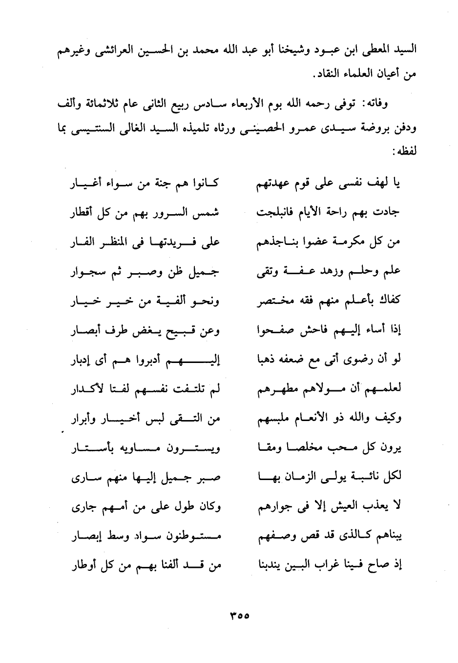 وفاته: توفي رحمه الله يوم الأربعاء سادس ربيع الثاني عام ثلاثمائة وألف ودفن بروضة سيدي عمرو الحصينى ورثاه تلميذه السيد الغالى السنتيسى بما لفظه: