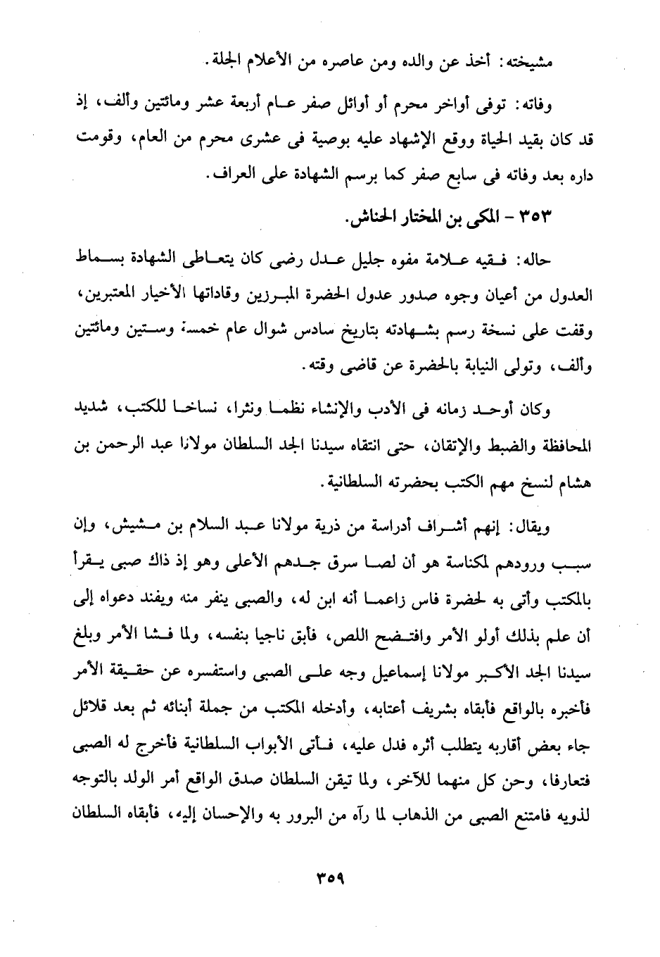 وكان أوحد زمانه في الأدب والإنشاء نظما ونثرا، نساخا للكتب، شديد المحافظة والضبط والإتقان، حتى انتقاه سيدنا الجد السلطان مولانا عبد الرحمن بن هشام لنسخ مهم الكتب بحضرته السلطانية.