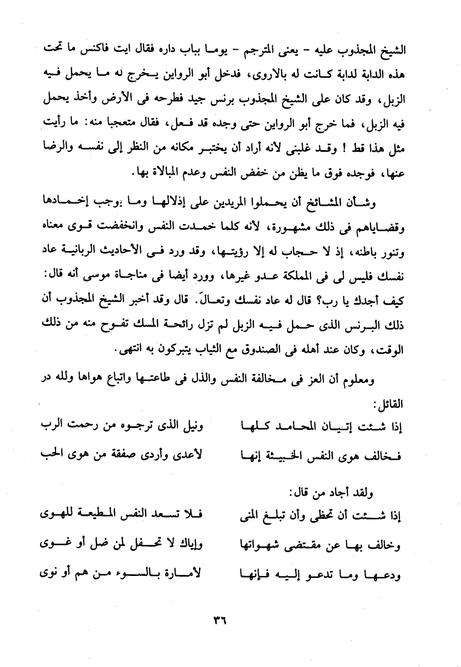 وشأن المشائخ أن يحملوا المريدين على إذلالها وما يوجب إخمادها وقضاياهم في ذلك مشهورة، لأنه كلما خمدت النفس وانخفضت قوى معناه وتنور باطنه، إذ لا حجاب له إلا رؤيتها، وقد ورد في الأحاديث الربانية عاد نفسك فليس لى في المملكة عدو غيرها، وورد أيضًا في مناجاة موسى أنه قال: كيف أجدك يا رب؟ قال له عاد نفسك وتعالَ. قال وقد أخبر الشيخ المجذوب أن ذلك البرنس الذى حمل فيه الزبل لم تزل رائحة المسك تفوح منه من ذلك الوقت، وكان عند أهله في الصندوق مع الثياب يتبركون به انتهى.