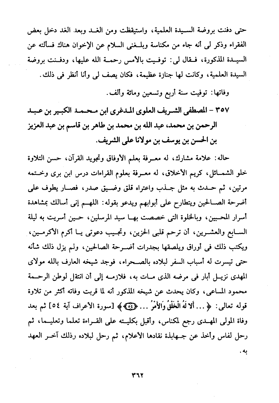 357 - المصطفى الشريف العلوى المدغرى ابن محمد الكبير بن عبد الرحمن بن محمَّد، عبد الله بن محمَّد بن طاهر بن قاسم بن عبد العزيز بن الحسن بن يوسف بن مولانا على الشريف.