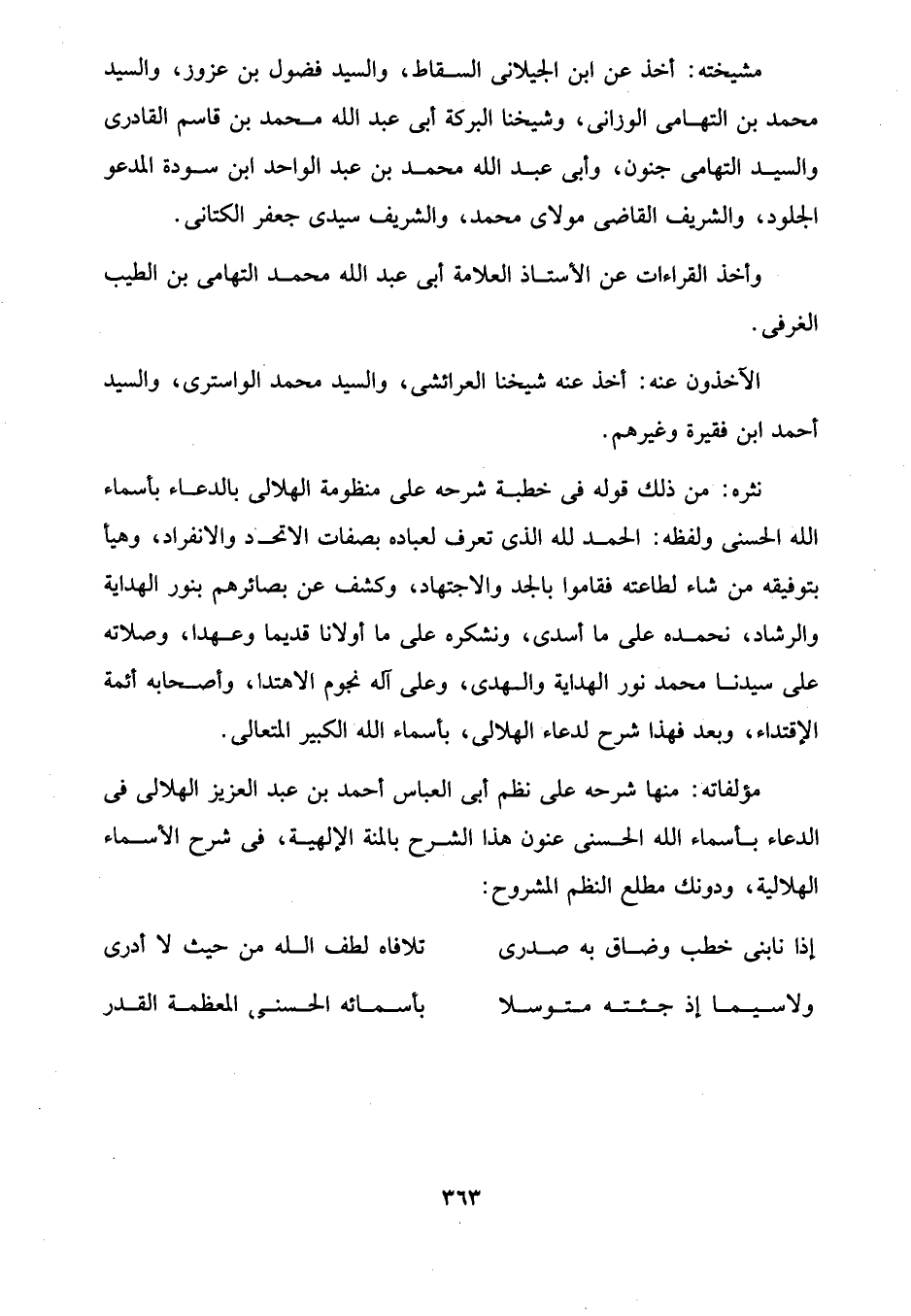 نثره: من ذلك قوله في خطبة شرحه على منظومة الهلالى بالدعاء بأسماء الله الحسنى ولفظه: الحمد لله الذي تعرف لعباده بصفات الاتحاد والانفراد، وهيأ بتوفيقه من شاء لطاعته فقاموا بالجد والاجتهاد، وكشف عن بصائرهم بنور الهداية والرشاد، نحمده على ما أسدى، ونشكره على ما أولانا قديما وعهدا، وصلاته على سيدنا محمَّد نور الهداية والهدى، وعلى آله نجوم الاهتدا، وأصحابه أئمة الإقتداء، وبعد فهذا شرح لدعاء الهلالى، بأسماء الله الكبير المتعالى.