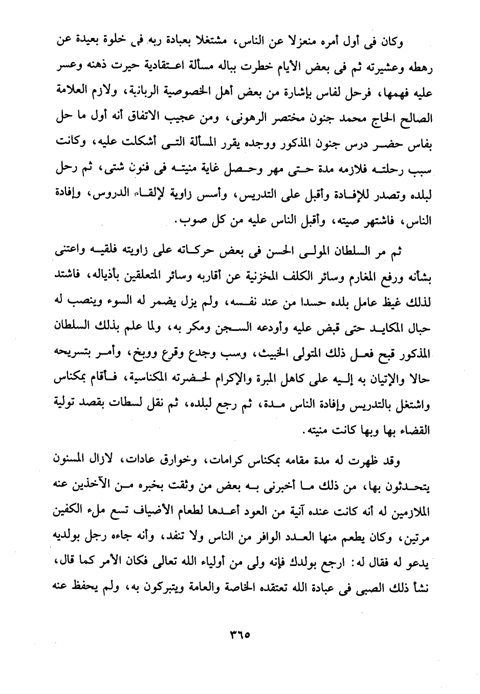 ثم مر السلطان المولى الحسن في بعض حركاته على زاويته فلقيه واعتنى بشأنه ورفع المغارم وسائر الكلف المخزنية عن أقاربه وسائر المتعلقين بأذياله، فاشتد لذلك غيظ عامل بلده حسدا من عند نفسه، ولم يزل يضمر له السوء وينصب له حبال المكايد حتى قبض عليه وأودعه السجن ومكر به، ولما علم بذلك السلطان المذكور قبح فعل ذلك المتولى الخبيث، وسب وجدع وقرع ووبخ، وأمر بتسريحه حالا والإتيان به إليه على كاهل المبرة والإكرام لحضرته المكناسية، فأقام بمكناس واشتغل بالتدريس وإفادة الناس مدة، ثم رجع لبلده، ثم نقل لسطات بقصد تولية القضاء بها وبها كانت منيته.