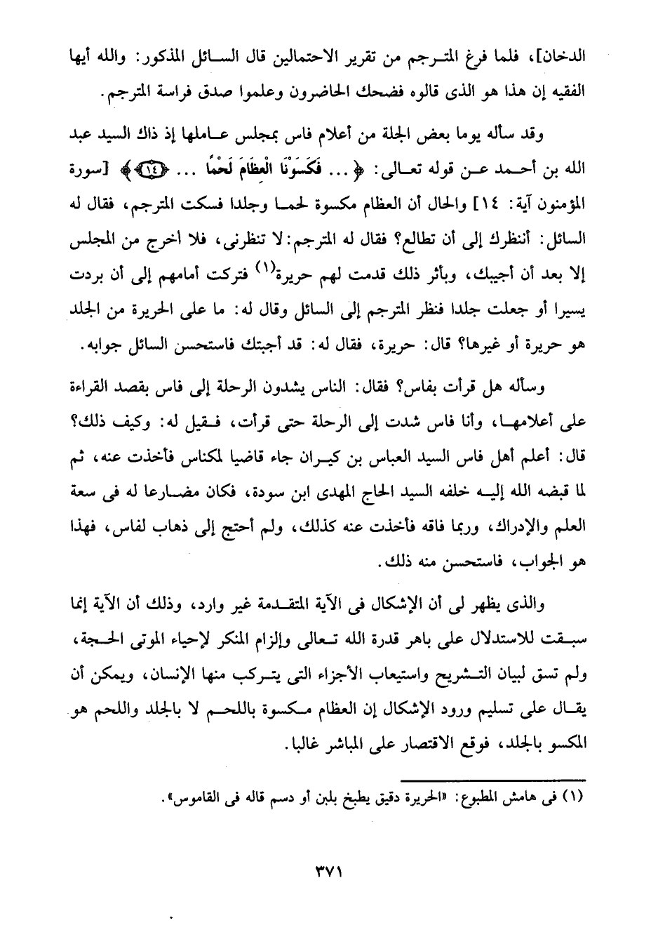 وقد سأله يوما بعض الجلة من أعلام فاس بمجلس عاملها إذ ذاك السيد عبد الله بن أحمد عن قوله تعالى: {... فَكَسَوْنَا الْعِظَامَ لَحْمًا ... (14)} [سورة المؤمنون آية: 14] والحال أن العظام مكسوة لحما وجلدا فسكت المترجم، فقال له السائل: أننظرك إلى أن تطالع؟ فقال له المترجم: لا تنظرنى، فلا أخرج من المجلس إلا بعد أن أجيبك، وبأثر ذلك قدمت لهم حريرة (¬1) فتركت أمامهم إلى أن بردت يسيرا أو جعلت جلدا فنظر المترجم إلى السائل وقال له: ما على الحريرة من الجلد هو حريرة أو غيرها؟ قال: حريرة، فقال له: قد أجبتك فاستحسن السائل جوابه.