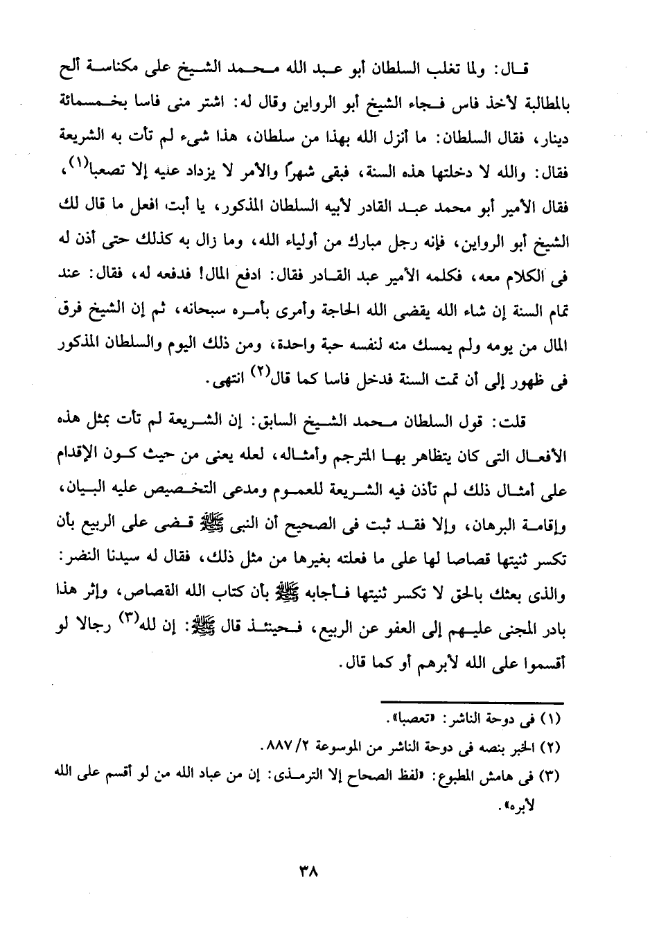 قلت: قول السلطان محمد الشيخ السابق: إن الشريعة لم تأت بمثل هذه الأفعال التي كان يتظاهر بها المترجم وأمثاله، لعله يعنى من حيث كون الإقدام على أمثال ذلك لم تأذن فيه الشريعة للعموم ومدعى التخصيص عليه البيان، وإقامة البرهان، وإلا فقد ثبت في الصحيح أن النبي - صلى الله عليه وسلم - قضى على الربيع بأن تكسر ثنيتها قصاصا لها على ما فعلته بغيرها من مثل ذلك، فقال له سيدنا النضر: والذي بعثك بالحق لا تكسر ثنيتها فأجابه - صلى الله عليه وسلم - بأن كتاب الله القصاص، وإثر هذا بادر المجنى عليهم إلى العفو عن الربيع، فحينئذ قال - صلى الله عليه وسلم -: إن لله (¬3) رجالا لو أقسموا على الله لأبرهم أو كما قال.