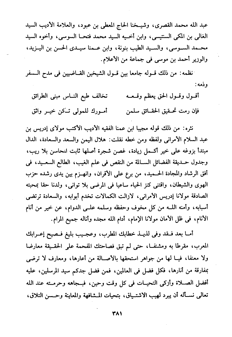 أما بعد فقد وفي لذيذ خطابك المطرب، وعجيب بليغ فصيح إعرابك المعرب، مقرطا به ومشنفا، حتى لم تبق فصاحتك المفحمة على الحقيقة معارضا ولا معنفا، فيا لها من جواهر استحقها بالأصالة من أعارها، ومعارف لا ترضى بمفارقة من أنارها، فكل فضل في العالمين، فمن فضل جدكم سيد المرسلين، عليه أفضل الصلاة وأزكى التحيات في كل وقت وحين، فبجاهه وحرمته عند الله تعالى نسأله أن يبرد لهيب الاشتياق، بتحيات المشافهة والمعاينة وحسن التلاق،