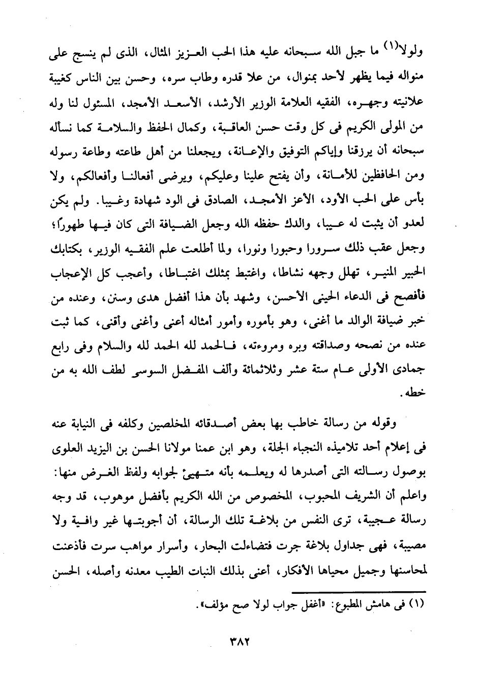 ولولا (¬1) ما جبل الله سبحانه عليه هذا الحب العزيز المثال، الذي لم ينسج على منواله فيما يظهر لأحد بمنوال، من على قدره وطاب سره، وحسن بين الناس كغيبة علانيته وجهره، الفقيه العلامة الوزير الأرشد، الأسعد الأمجد، المسئول لنا وله من المولى الكريم في كل وقت حسن العاقبة، وكمال الحفظ والسلامة كما نسأله سبحانه أن يرزقنا وإياكم التوفيق والإعانة، ويجعلنا من أهل طاعته وطاعة رسوله ومن الحافظين للأمانة، وأن يفتح علينا وعليكم، ويرضى أفعالنا وأفعالكم، ولا بأس على الحب الأود، الأعز الأمجد، الصادق في الود شهادة وغيبا. ولم يكن لعدو أن يثبت له عيبا، والدك حفظه الله وجعل الضيافة التي كان فيها طهورًا؛ وجعل عقب ذلك سرورا وحبورا ونورا، ولما أطلعت علم الفقيه الوزير، بكتابك الحبير المنير، تهلل وجهه نشاطا، واغتبط بمثلك اغتباطا، وأعجب كل الإعجاب فأفصح في الدعاء الحينى الأحسن، وشهد بأن هذا أفضل هدى وسنن، وعنده من خبر ضيافة الوالد ما أغنى، وهو بأموره وأمور أمثاله أعنى وأغنى وأقنى، كما ثبت عنده من نصحه وصداقته وبره ومروءته، فالحمد لله الحمد لله والسلام وفي رابع جمادى الأولى عام ستة عشر وثلاثمائة وألف المفضل السوسى لطف الله به من خطه.