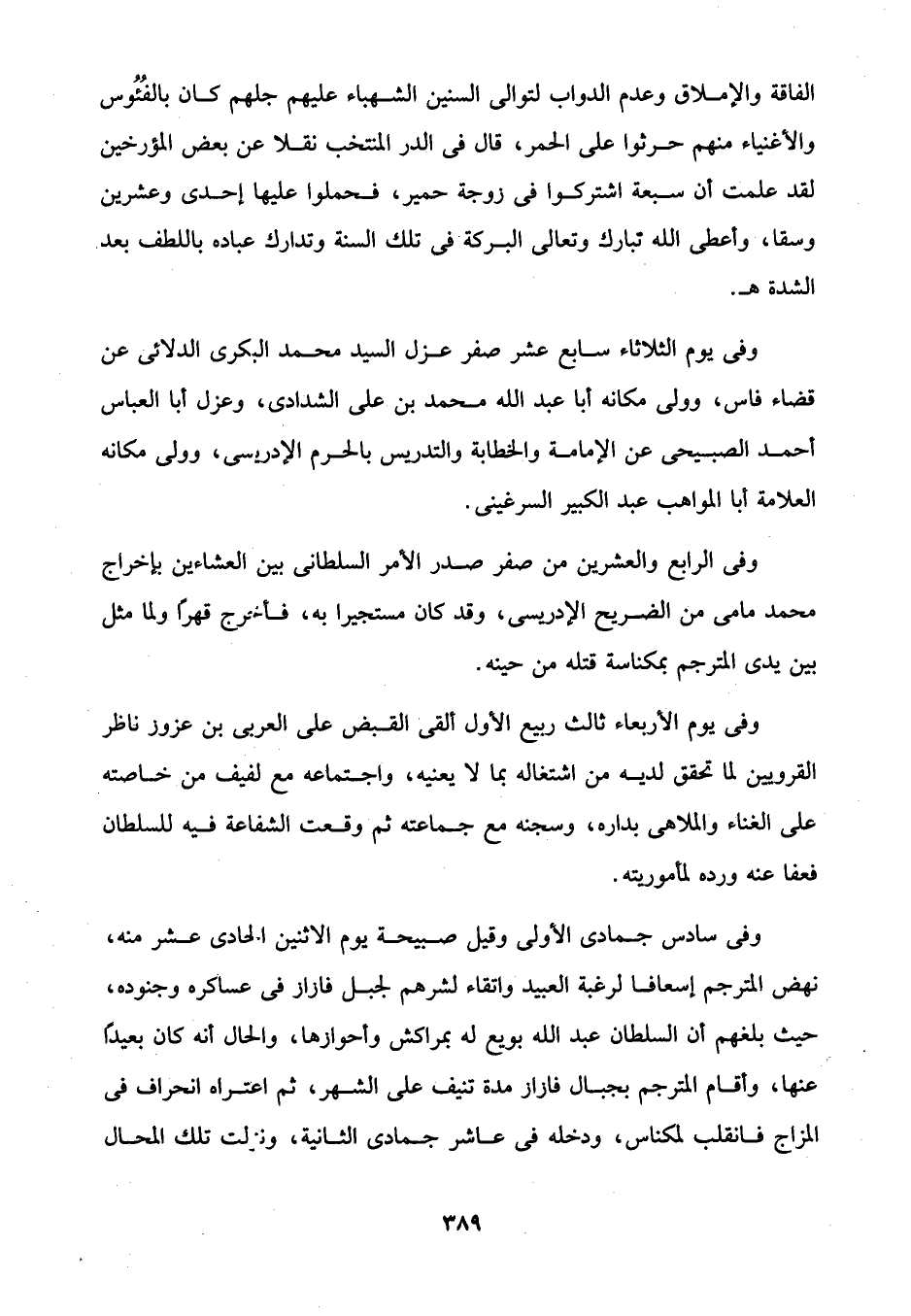 وفي يوم الثلاثاء سابع عشر صفر عزل السيد محمَّد البكرى الدلائى عن قضاء فاس، وولى مكانه أَبا عبد الله محمَّد بن عليّ الشدادى، وعزل أَبا العباس أَحْمد الصبيحى عن الإمامة والخطابة والتدريس بالحرم الإدريسى، وولى مكانه العلامة أَبا المواهب عبد الكبير السرغينى.