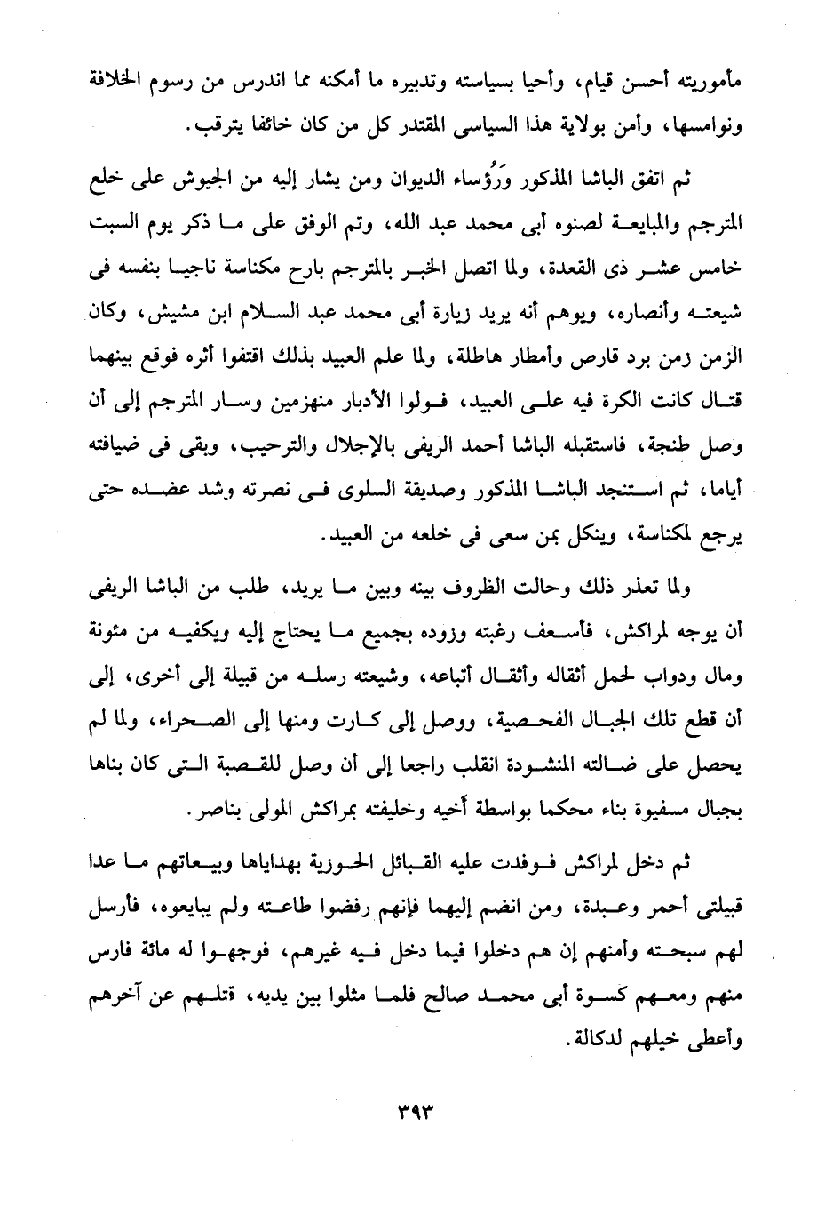 ثم اتفق الباشا المذكور وَرُؤساء الديوان ومن يشار إليه من الجيوش على خلع المترجم والمبايعة لصنوه أبي محمَّد عبد الله، وتم الوفق على ما ذكر يوم السبت خامس عشر ذى القعدة، ولما اتصل الخبر بالمترجم بارح مكناسة ناجيا بنفسه في شيعته وأنصاره، ويوهم أنَّه يريد زيارة أبي محمَّد عبد السلام ابن مشيش، وكان الزمن زمن برد قارص وأمطار هاطلة، ولما علم العبيد بذلك اقتفوا أثره فوقع بينهما قتال كانت الكرة فيه على العبيد، فولوا الأدبار منهزمين وسار المترجم إلى أن وصل طنجة، فاستقبله الباشا أَحْمد الريفى بالإجلال والترحيب، وبقى في ضيافته أيامًا، ثم استنجد الباشا المذكور وصديقة السلوى في نصرته، وشد عضده حتَّى يرجع لمكناسة، وينكل بمن سعى في خلعه من العبيد.