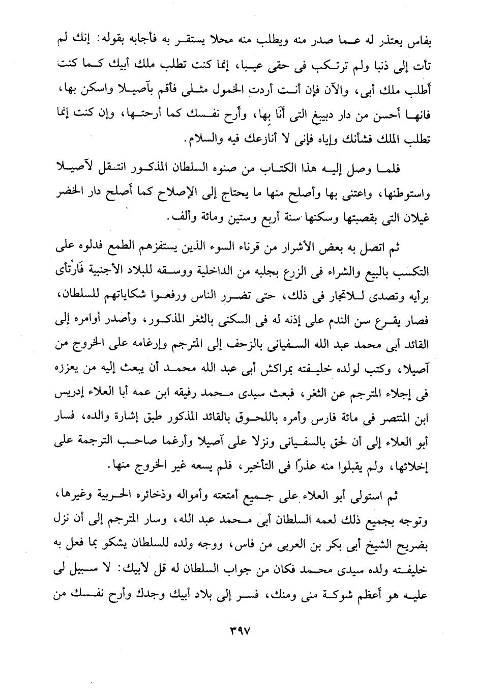 فلما وصل إليه هذا الكتاب من صنوه السلطان المذكور انتقل لآصيلا واستوطنها، واعتنى بها وأصلح منها ما يحتاج إلى الإصلاح كما أَصلح دار الخضر غيلان التي بقصبتها وسكنها سنة أربع وستين ومائة وألف.