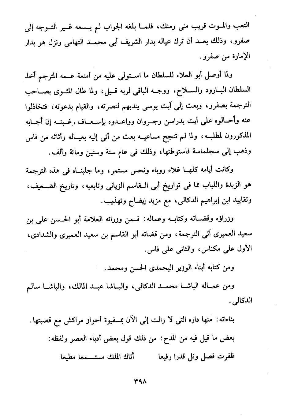 وكانت أيامه كلها غلاء ووباء ونحس مستمر، وما جلبناه في هذه الترجمة هو الزبدة واللباب مما في تواريخ أبي القاسم الزيانى وتابعيه، وتاريخ الضعيف، وتقاييد ابن إبراهيم الدكالى، مع مزيد إيضاح وتهذيب.