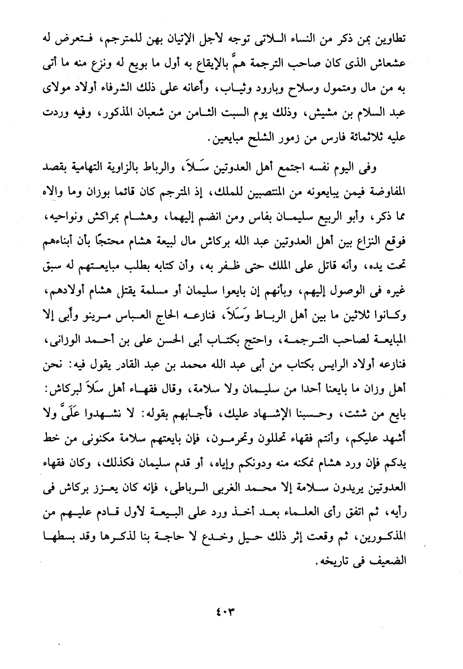 وفي اليوم نفسه اجتمع أهل العدوتين سَلَا، والرباط بالزاوية التهامية بقصد المفاوضة فيمن يبايعونه من المنتصبين للملك، إذ المترجم كان قائما بوزان وما والاه مما ذكر، وأبو الرَّبيع سليمان بفاس ومن انضم إليهما، وهشام بمراكش ونواحيه، فوقع النزاع بين أهل العدوتين عبد الله بركاش مال لبيعة هشام محتجًا بأن أبناءهم تحت يده، وأنه قاتل على الملك حتَّى ظفر به، وأن كتابه بطلب مبايعتهم له سبق غيره في الوصول إليهم، وبأنهم إن بايعوا سليمان أو مسلمة يقتل هشام أولادهم، وكانوا ثلاثين ما بين أهل الرباط وَسَلَا، فنازعه الحاج العباس مرينو وأبي إلَّا المبايعة لصاحب الترجمة، واحتج بكتاب أبي الحسن على بن أَحْمد الوزانى، فنازعه أولاد الرايس بكتاب من أبي عبد الله محمَّد بن عبد القادر يقول فيه: نحن أهل وزان ما بايعنا أحدًا من سليمان ولا سلامة، وقال فقهاء أهل سَلَا لبركاش: بايع من شئت، وحسبنا الإشهاد عليك، فأجابهم بقوله: لا تشهدوا عَلَيَّ ولا أشهد عليكم، وأنتم فقهاء تحللون وتحرمون، فإن بايعتهم سلامة مكنونى من خط يدكم فإن ورد هشام نمكنه منه ودونكم وإياه، أو قدم سليمان فكذلك، وكان فقهاء العدوتين يريدون سلامة إلَّا محمَّد الغربى الرباطى، فإنَّه كان يعزز بركاش في رأيه، ثم اتفق رأى العلماء بعد أخذ ورد على البيعة لأول قادم عليهم من المذكورين، ثم وقعت إثر ذلك حيل وخدع لا حاجة بنا لذكرها وقد بسطها الضعيف في تاريخه.