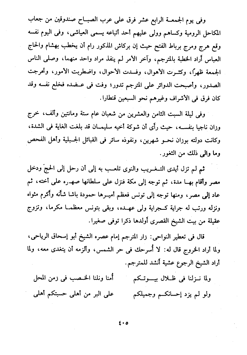 ثم لم تزل أيدى التغريب والنوى تلعب به إلى أن رحل إلى الحج ودخل مصر وأقام بها مدة، ثم توجه إلى مكة فنزل على سلطانها صهره على أخته، ثم عاد إلى مصر، ومنها توجه إلى تونس فعظم أميرها حمودة باشا شأَنه وأَكرم مثواه ونزله ورتب له جراية كجراية ولى عهده، وبقى بتونس معظما مكرما، وتزوج عقيلة من بيت الشيخ القصرى أَولدها ذكرًا تُوفِّي صغيرًا.