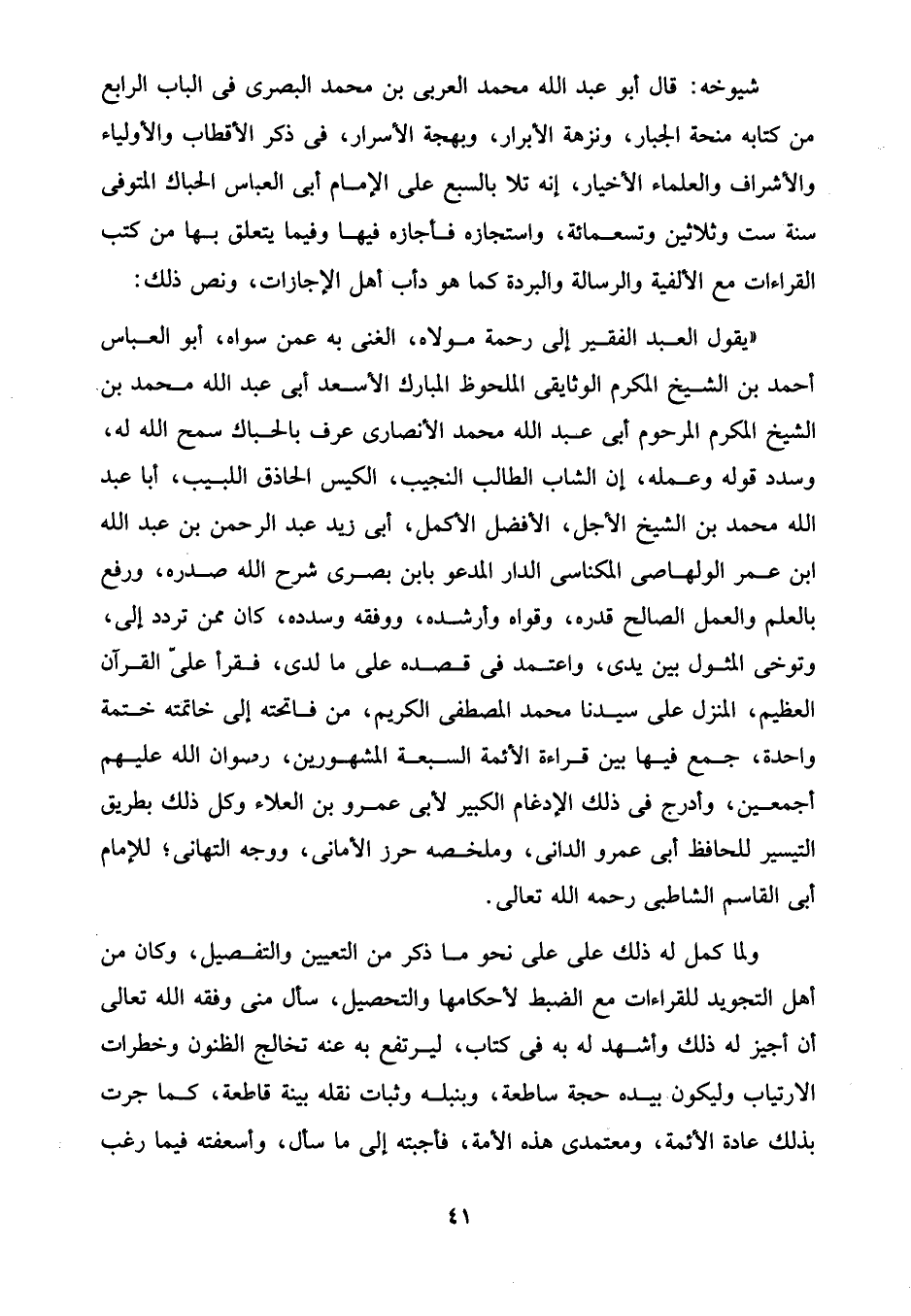 ولما كمل له ذلك على على نحو ما ذكر من التعيين والتفصيل، وكان من أهل التجويد للقراءات مع الضبط لأحكامها والتحصيل، سأل منى وفقه الله تعالى أن أجيز له ذلك وأشهد له به في كتاب، ليرتفع به عنه تخالج الظنون وخطرات الارتياب وليكون بيده حجة ساطعة، وبنبله وثبات نقله بينة قاطعة، كما جرت بذلك عادة الأئمة، ومعتمدى هذه الأمة، فأجبته إلى ما سأل، وأسعفته فيما رغب