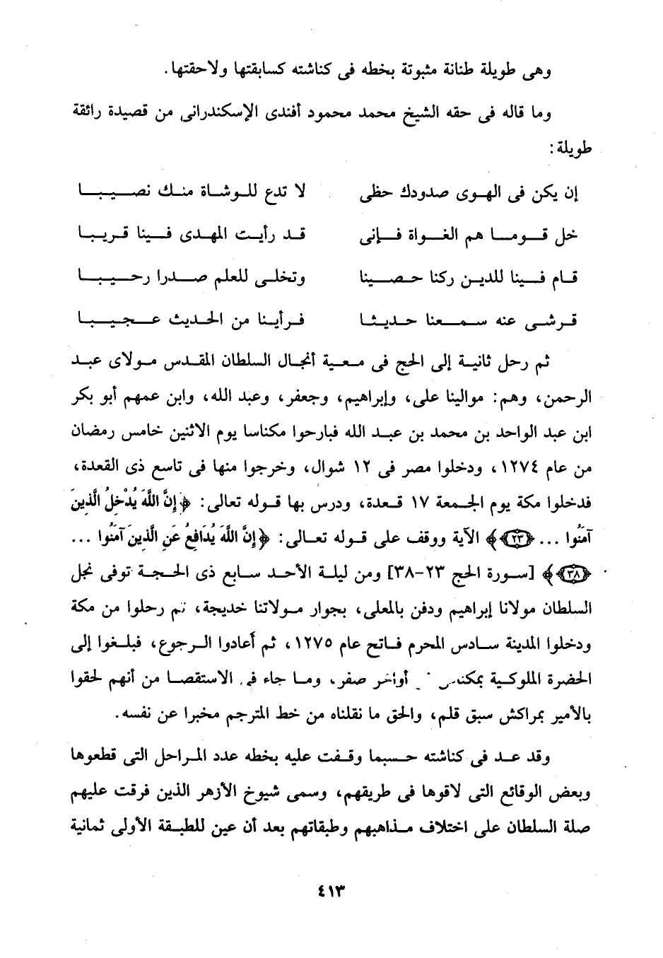 ثم رحل ثانية إلى الحج في معية أنجال السلطان المقدس مولاى عبد الرَّحْمَن، وهم: موالينا على، وإبراهيم، وجعفر، وعبد الله، وابن عمهم أبو بكر ابن عبد الواحد بن محمَّد بن عبد الله فبارحوا مكناسا يوم الاثنين خامس رمضان من عام 1274، ودخلوا مصر في 12 شوال، وخرجوا منها في تاسع ذى القعدة، فدخلوا مكة يوم الجمعة 17 قعدة، ودرس بها قوله تعالى: {إِنَّ اللَّهَ يُدْخِلُ الَّذِينَ آمَنُوا ... (23)} الآية ووقف على قوله تعالى: {إِنَّ اللَّهَ يُدَافِعُ عَنِ الَّذِينَ آمَنُوا ... (38)} [سورة الحج 23 - 38] ومن ليلة الأحد سابع ذى الحجة تُوفِّي نجل السلطان مولانا إبراهيم ودفن بالمعلى، بجوار مولاتنا خديجة، ثم رحلوا من مكة ودخلوا المدينة سادس المحرم فاتح عام 1275، ثم أَعادوا الرجوع، فبلغوا إلى الحضرة الملوكية بمكناس أواخر صفر، وما جاء في الاستقصا من أنَّهم لحقوا بالأمير بمراكش سبق قلم، والحق ما نقلناه من خط المترجم مخبرا عن نفسه.