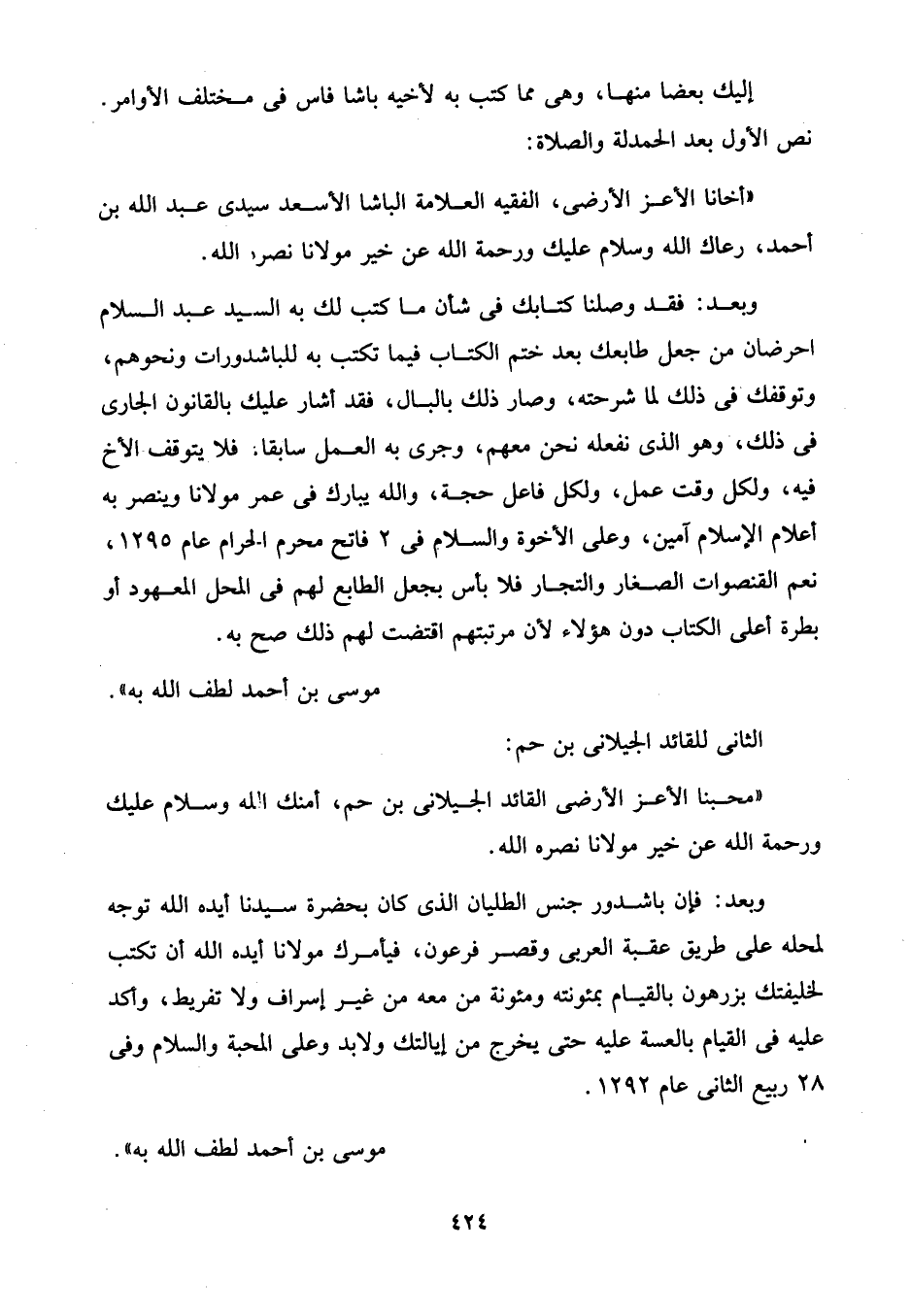 وبعد: فقد وصلنا كتابك في شأن ما كتب لك به السيد عبد السلام احرضان من جعل طابعك بعد ختم الكتاب فيما تكتب به للباشدورات ونحوهم، وتوقفك في ذلك لما شرحته، وصار ذلك بالبال، فقد أشار عليك بالقانون الجارى في ذلك، وهو الذي نفعله نحن معهم، وجرى به العمل سابقا, فلا يتوقف الأخ فيه، ولكل وقت عمل، ولكل فاعل حجة، والله يبارك في عمر مولانا وينصر به أعلام الإِسلام آمين، وعلى الأخوة والسلام في 2 فاتح محرم الحرام عام 1295، نعم القنصوات الصغار والتجار فلا بأس بجعل الطابع لهم في المحل المعهود أو بطرة أعلى الكتاب دون هؤلاء لأن مرتبتهم اقتضت لهم ذلك صح به.