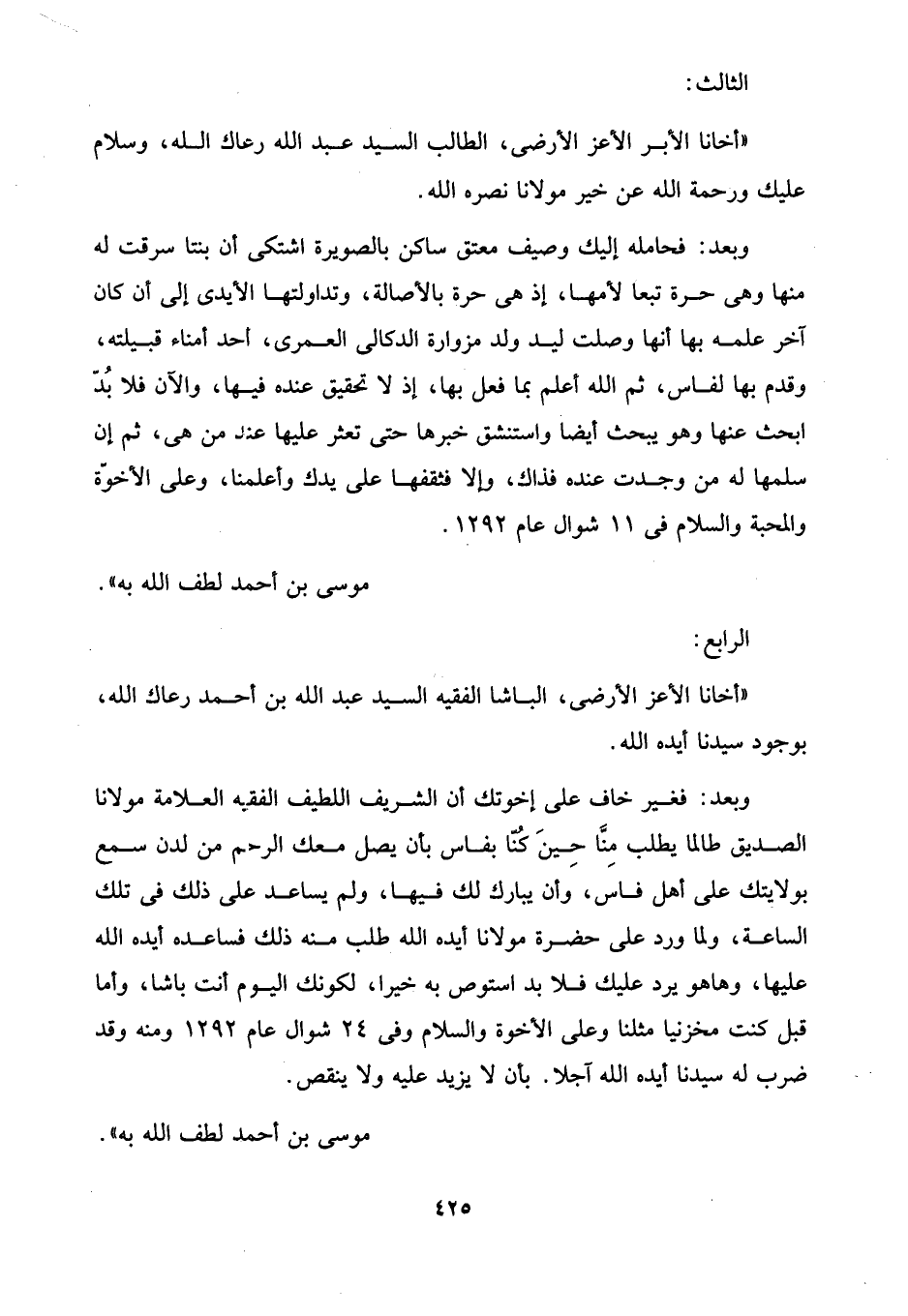 وبعد: فحامله إليك وصيف معتق ساكن بالصويرة اشتكى أن بنتا سرقت له منها وهي حرة تبعًا لأمها، إذ هي حرة بالأصالة، وتداولتها الأيدي إلى أن كان آخر علمه بها أنها وصلت ليد ولد مزوارة الدكالى العمري، أحد أمناء قبيلته، وقدم بها لفاس، ثم الله أعلم بما فعل بها، إذ لا تحقيق عنده فيها، والآن فلا بُدّ ابحث عنها وهو يبحث أَيضًا واستنشق خبرها حتَّى تعثر عليها عند من هي، ثم إن سلمها له من وجدت عنده فذاك، وإلا فثقفها على يدك وأعلمنا، وعلى الأخوّة والمحبة والسلام في 11 شوال عام 1292.