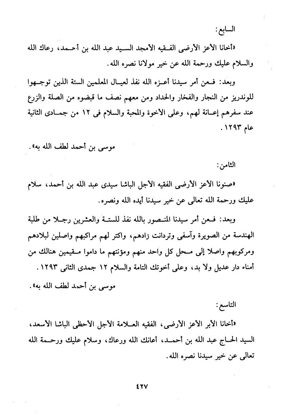 وبعد: فعن أمر سيدنا المنصور بالله نفذ للستة والعشرين رجلًا من طلبة الهندسة من الصويرة وآسفى وتردانت زادهم، واكتر لهم مراكبهم واصلين لبلادهم ومركوبهم واصلا إلى محل كل واحد منهم ومؤنتهم ما داموا مقيمين هنالك من أمناء دار عديل ولا بد، وعلى أخوتك التامة والسلام 12 جمدى الثاني 1293.