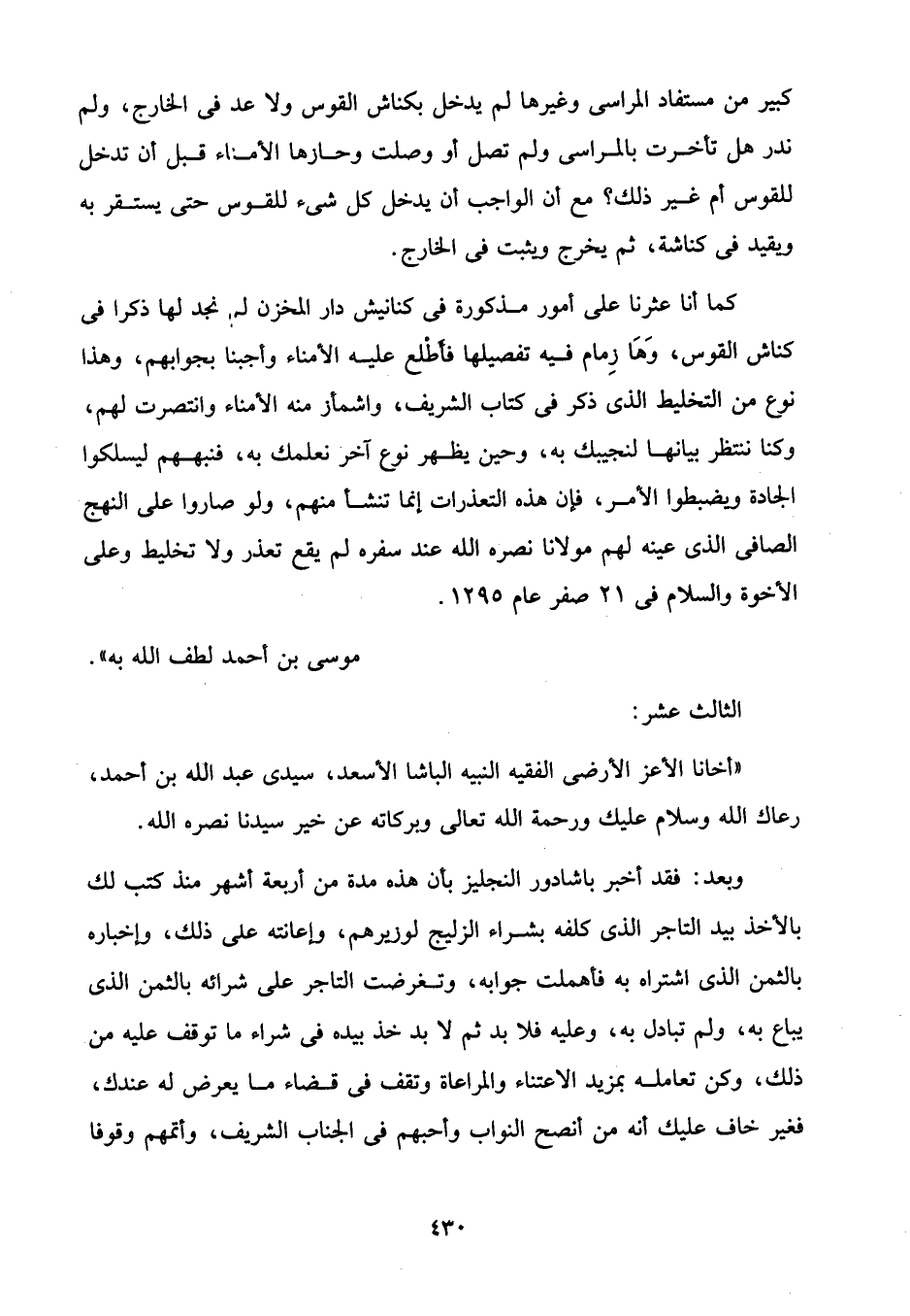 كما أنا عثرنا على أمور مذكورة في كنانيش دار المخزن لم نجد لها ذكرا في كناش القوس، وَهَا زِمام فيه تفصيلها فأَطْلع عليه الأمناء وأجبنا بجوابهم، وهذا نوع من التخليط الذي ذكر في كتاب الشريف، واشمأز منه الأمناء وانتصرت لهم، وكنا ننتظر بيانها لنجيبك به، وحين يظهر نوع آخر نعلمك به، فنبههم ليسلكوا الجادة ويضبطوا الأمر، فإن هذه التعذرات إنما تنشأ منهم، ولو صاروا على النهج الصافى الذي عينه لهم مولانا نصره الله عند سفره لم يقع تعذر ولا تخليط وعلى الأخوة والسلام في 21 صفر عام 1295.