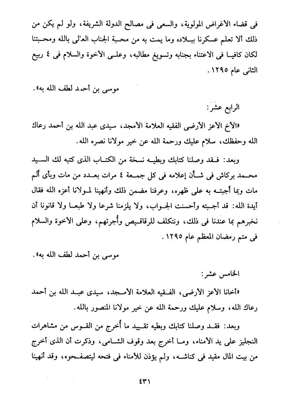 وبعد: فقد وصلنا كتابك وبطيه نسخة من الكتاب الذي كتبه لك السيد محمَّد بركاش في شأن إعلامه في كل جمعة 4 مرات بعدد من مات وبأى أَلم مات وبما أجبته به على ظهره، وعرفنا مضمن ذلك وأنهينا لمولانا أعزه الله فقال أيده الله: قد أجبته وأحسنت الجواب، ولا يلزمنا شرعا ولا طبعا ولا قانونا أن نخبرهم بما عندنا في ذلك، ونتكلف للرقاقيص وأُجرتهم، وعلى الأخوة والسلام في متم رمضان المعظم عام 1295.