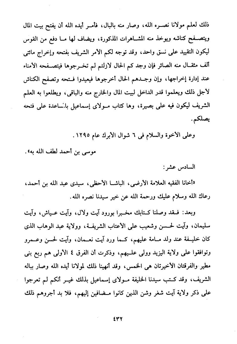 وبعد: فقد وصلنا كتابك مخبرا بورود آيت ولال، وآيت عياش، وآيت سليمان، وآيت لحسن وشعيب على الأعتاب الشريفة، وولاية عبد الوهاب الذى كان خليفة عند ولد مامة عليهم، كما ورد آيت نعمان، وآيت لحسن وعمرو وتوافقوا على ولاية اليزيد وولى عليهم، وذكرت أن الفرق 4 الأولى هم ربع بنى مطير والفرقتان الأخيرتان هي الخمس، وقد أنهينا ذلك لمولانا أيده الله وصار بباله الشريف، وقد كتب سيدنا الخليفة مولاى إسماعيل بذلك غير أنكم لم تعرجوا على ذكر ولاية آيت شغر وشن الذين كانوا مضافين إليهم، فلا بد أجروهم ذلك