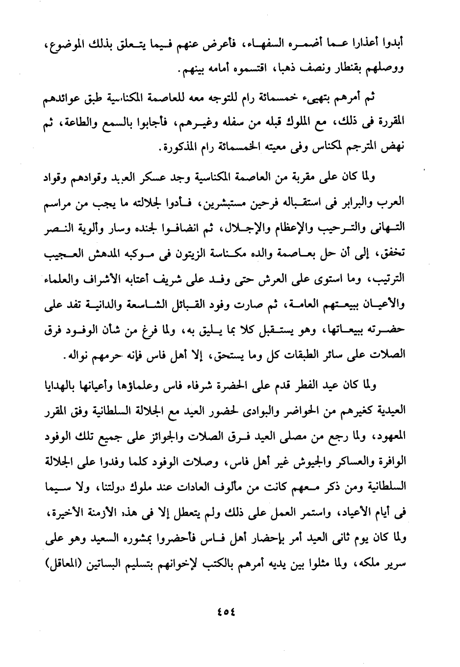 ولما كان عيد الفطر قدم على الحضرة شرفاء فاس وعلماؤها وأعيانها بالهدايا العيدية كغيرهم من الحواضر والبوادى لحضور العيد مع الجلالة السلطانية وفق المقرر المعهود، ولما رجع من مصلى العيد فرق الصلات والجوائز على جميع تلك الوفود الوافرة والعساكر والجيوش غير أهل فاس، وصلات الوفود كما وفدوا على الجلالة السلطانية ومن ذكر معهم كانت من مألوف العادات عند ملوك دولتنا، ولا سيما في أيَّام الأعياد، واستمر العمل على ذلك ولم يتعطل إلَّا في هذه الأزمنة الأخيرة، ولما كان يوم ثانى العيد أمر بإحضار أهل فاس فأحضروا بمشوره السعيد وهو على سرير ملكه، ولما مثلوا بين يديه أمرهم بالكتب لإخوانهم بتسليم البساتين (المعاقل)