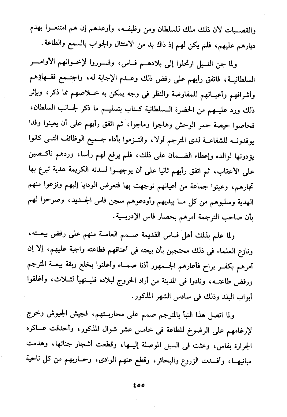 ولما جن الليل ارتحلوا إلى بلادهم فاس، وقرروا لإخوانهم الأوامر السلطانية، فاتفق رأيهم على رفض ذلك وعدم الإجابة له، واجتمع فقهاؤهم وأشرافهم وأعيانهم للمفاوضة والنظر في وجه يمكن به خلاصهم مما ذكر، وبإثر ذلك ورد عليهم من الحضرة السلطانية كتاب بتسليم ما ذكر لجانب السلطان، فحاصوا حيصة حمر الوحش وهاجوا وماجوا، ثم اتفق رأيهم على أن يعينوا وفدا يوفدونه للشفاعة لدى المترجم أولاً، والتزموا بأداء جميع الوظائف التي كانوا يؤدونها لوالده وإعطاء الضمان على ذلك، فلم يرفع لهم رأساً، وردهم ناكصين على الأعقاب، ثم اتفق رأيهم ثانيا على أن يوجهوا لسدته الكريمة هدية تبرع بها تجارهم، وعينوا جماعة من أعيانهم توجهت بها فتعرض الودايا إليهم ونزعوا منهم الهدية وسلبوهم من كل ما بيديهم وأودعوهم سجن فاس الجديد، وصرحوا لهم بأن صاحب الترجمة أمرهم بحصار فاس الإدريسية.