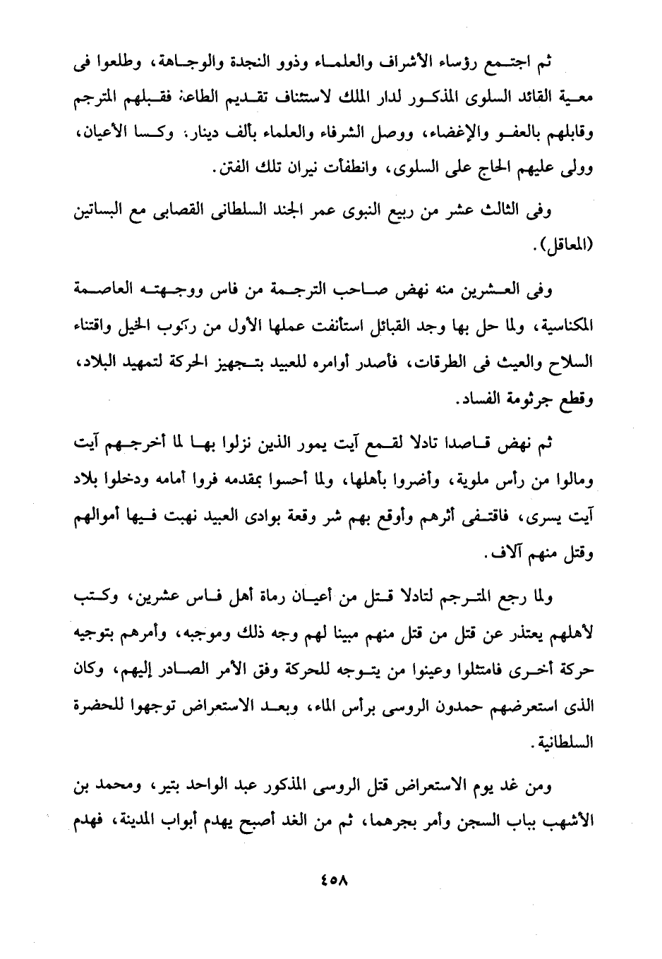ولما رجع المترجم لتادلا قتل من أعيان رماة أهل فاس عشرين، وكتب لأهلهم يعتذر عن قتل من قتل منهم مبيناً لهم وجه ذلك وموجبه، وأمرهم بتوجيه حركة أخرى فامتثلوا وعينوا من يتوجه للحركة وفق الأمر الصادر إليهم، وكان الذي استعرضهم حمدون الروسى برأس الماء، وبعد الاستعراض توجهوا للحضرة السلطانية.