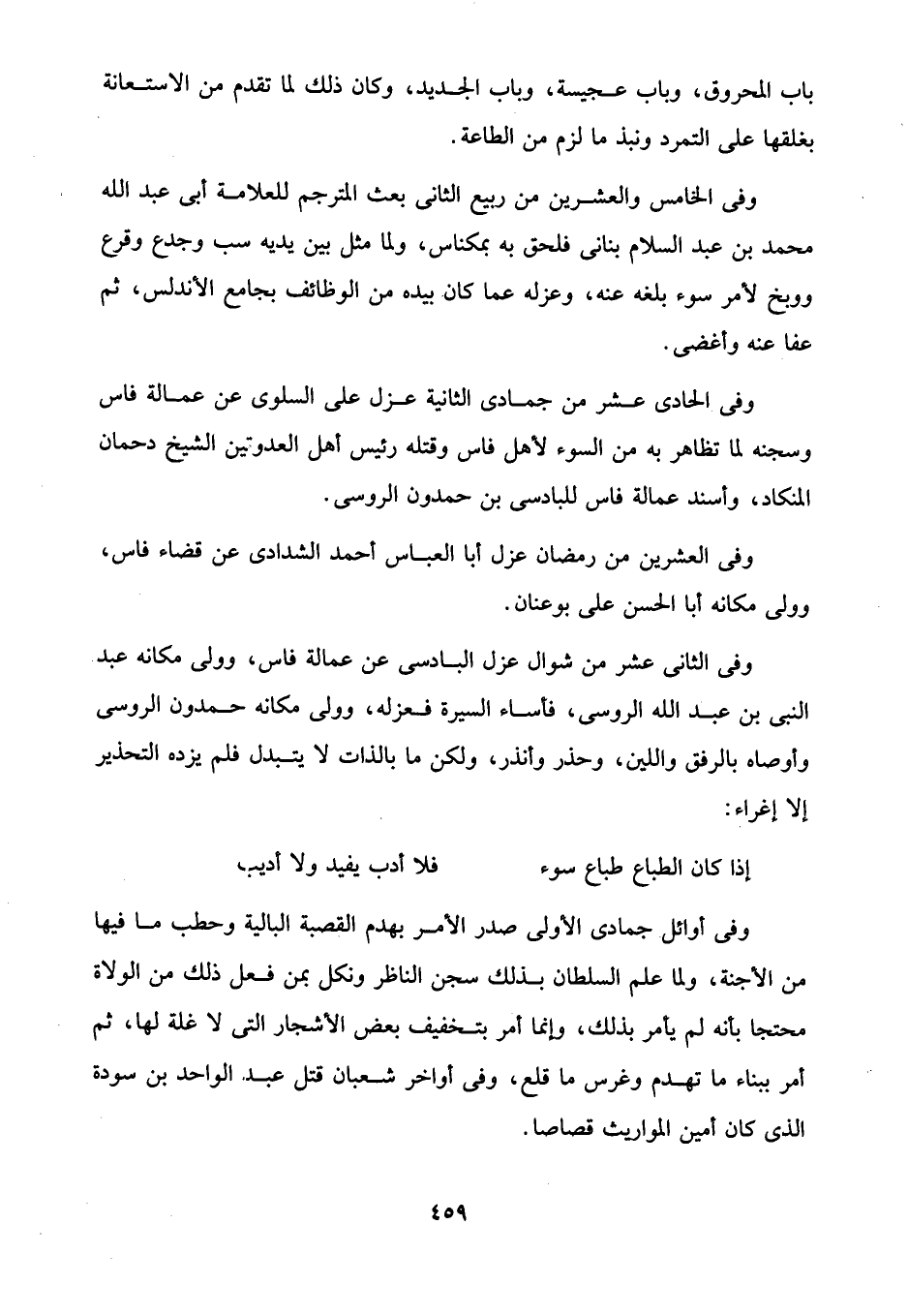 وفى الخامس والعشرين من ربيع الثَّاني بعث المترجم للعلامة أبي عبد الله محمد بن عبد السَّلام بنانى فلحق به بمكناس، ولما مثل بين يديه سب وجدع وقرع ووبخ لأمر سوء بلغه عنه، وعزله عما كان بيده من الوظائف بجامع الأندلس، ثم عفا عنه وأغضى.