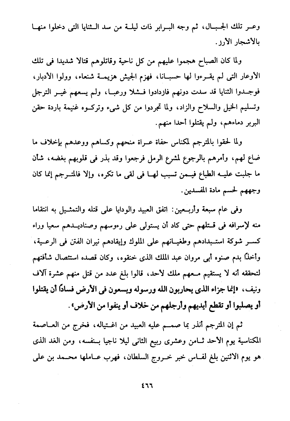 ولما كان الصباح هجموا عليهم من كل ناحية وقاتلوهم قتالاً شديداً في تلك الأوعار التي لم يقرءوا لها حسباناً، فهزم الجيش هزيمة شنعاء، وولوا الأدبار، فوجدوا الثَّنايا قد سدت دونهم فازدادوا فشلاً ورعباً، ولم يسعهم غير الترجل وتسليم الخيل والسلاح والزاد، ولما تجردوا من كل شيء وتركوه غنيمة باردة حقن البربر دماءهم، ولم يقتلوا أحداً منهم.